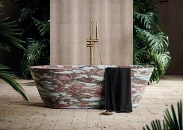 Experience unparalleled luxury with the Muse marble freestanding bath, a masterpiece cra ed from one of the world’s most soughta er marbles, Rosa Norwegian. luxebathroomstudio.com