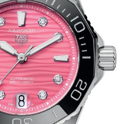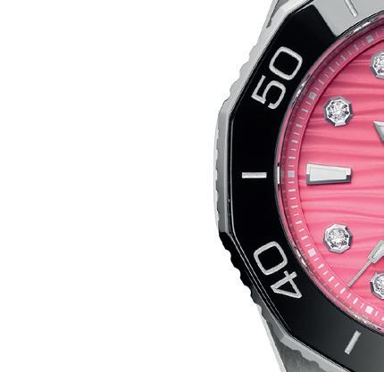 Pink Diamond Dial & Ceramic Bezel Ladies Automatic Watch has an intense pink waved dial with 8 diamond set hour markers, and date display at the 6 o'clock position. berrysjewellers.co.uk