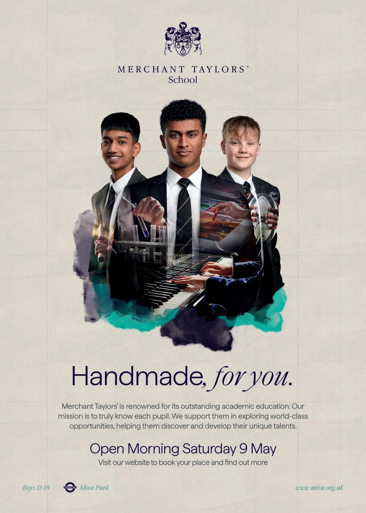 Merchant Taylors’ School blends centuries of tradition with a bold, forwardthinking ethos. Set across 280 acres in Northwood, it provides a dynamic and rigorous education for boys aged 11–18, combining academic ambition with personal growth. Founded in 1561, the school has long been known for academic excellence, but its true strength lies in the way it nurtures the whole person – developing intellect, character and confidence in equal measure. Every boy is known, valued and supported through a distinctive coaching culture that sits at the heart of school life. Teachers act as mentors as well as educators, engaging boys in thoughtful conversations about their progress and aspirations. Through this approach, pupils learn to take ownership of their learning, to reflect on their strengths, and to see challenge as an opportunity for growth.