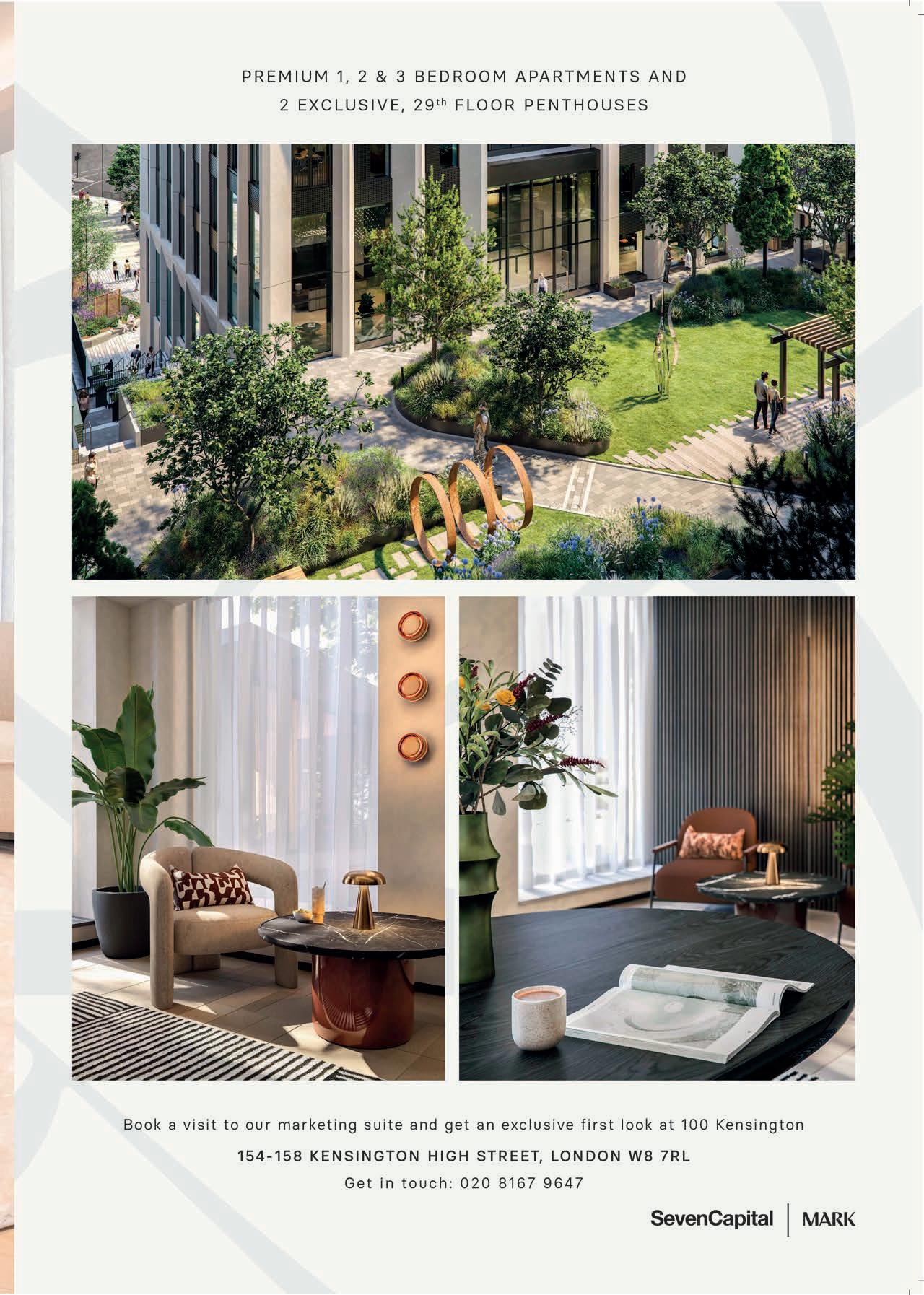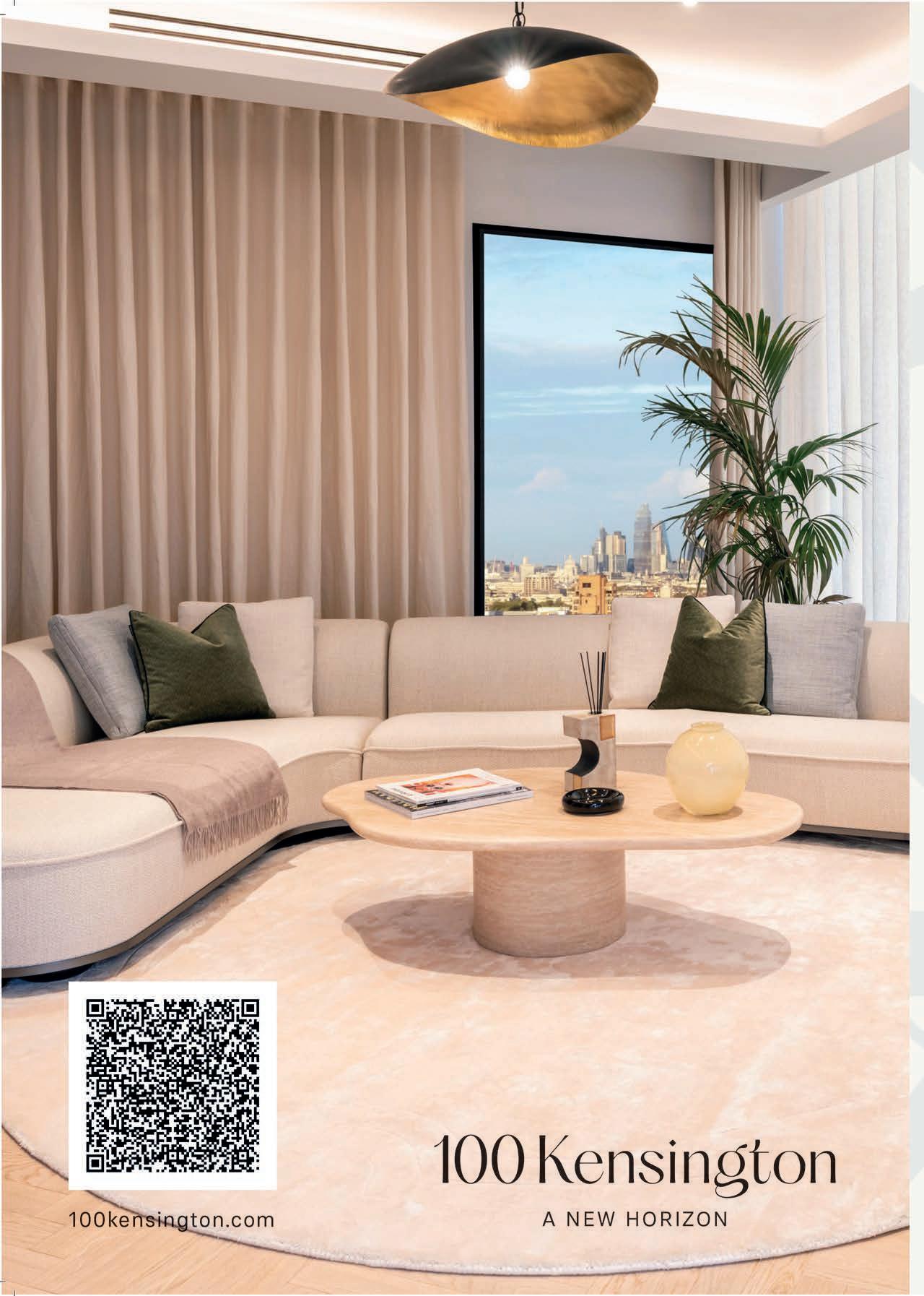 sized townhouses. High-quality design and workmanship throughout the development and integration of tenures, supports a genuinely inclusive urban community. Situated within a 10-minute walk of Earl’s Court, West Kensington, and Kensington Olympia stations, 100 Kensington o ers enviable connectivity. Cultural institutions like the V&A, Natural History Museum, and Science Museum are moments away, while a range of retail and dining locations are all within easy access. From the vibrancy of buzzing Kensington High Street and South Kensington to the luxury fashion and fine dining of Knightsbridge, residents are spoilt for choice. Potential residents can immerse themselves in 100 Kensington and experience fine apartment living, by visiting the 100 Kensington marketing suite at Kensington High Street. Visitors will find a tabletop model that sets out the scheme clearly, supported by an interactive digital presentation that allows visitors to admire not only the layout out and design, but also the views. A full-scale show apartment is also available to view, replicating the exact finishes and design details of the completed market sale apartments.