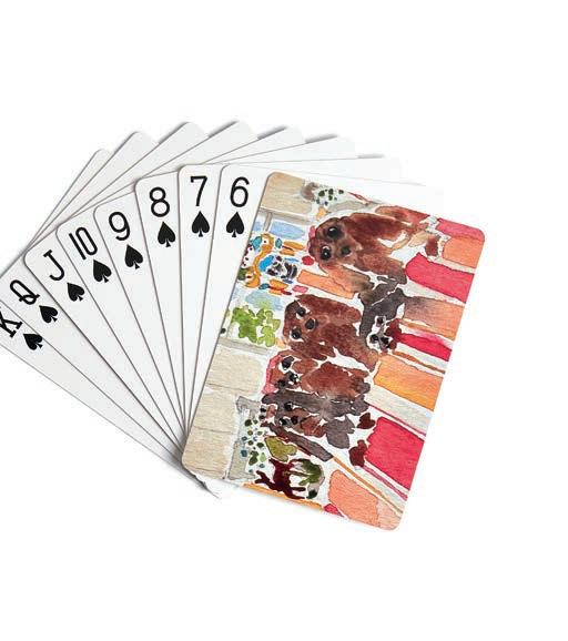 Kit Kemp's Our Furry Friends playing cards showcase a watercolour illustration of Kit’s beloved pups, housed in a sleek acrylic box with magnet corners, £25. kitkemp.com