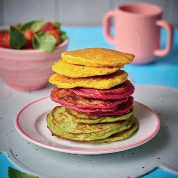 225 self-raising flour • 2 large eggs • 180ml milk • 75g Cheddar cheese grated • Sunflower oil • 240g sweetcorn drained • 1 tsp ground turmeric • 150g cooked beetroot, diced • 75g courgette,grated • 180g cooked peas