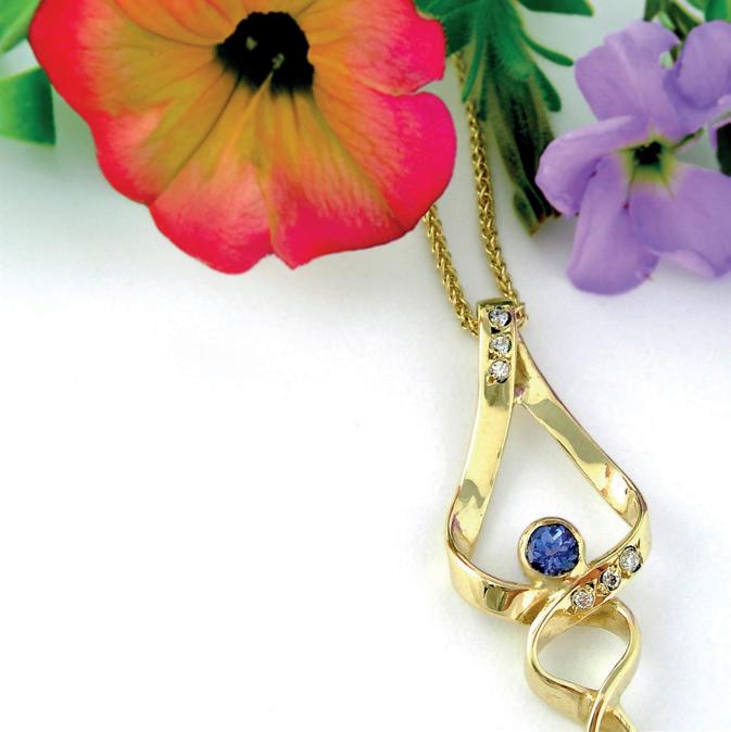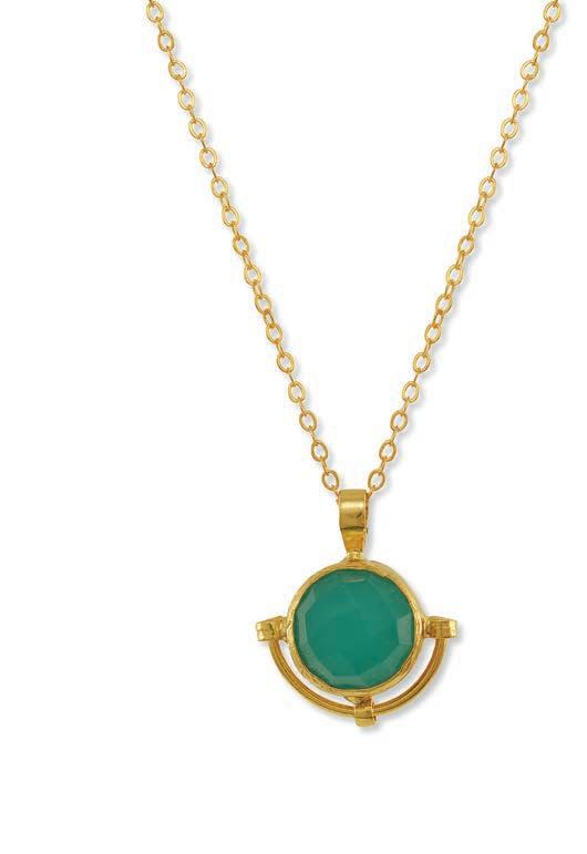 Handcra ed in Istanbul, the he Domna Aqua Chalcedony Pendant Necklace is a vibrant piece made in 21ct gold-plated recycled brass with a striking green gemstone, £75. ottomanhands.com