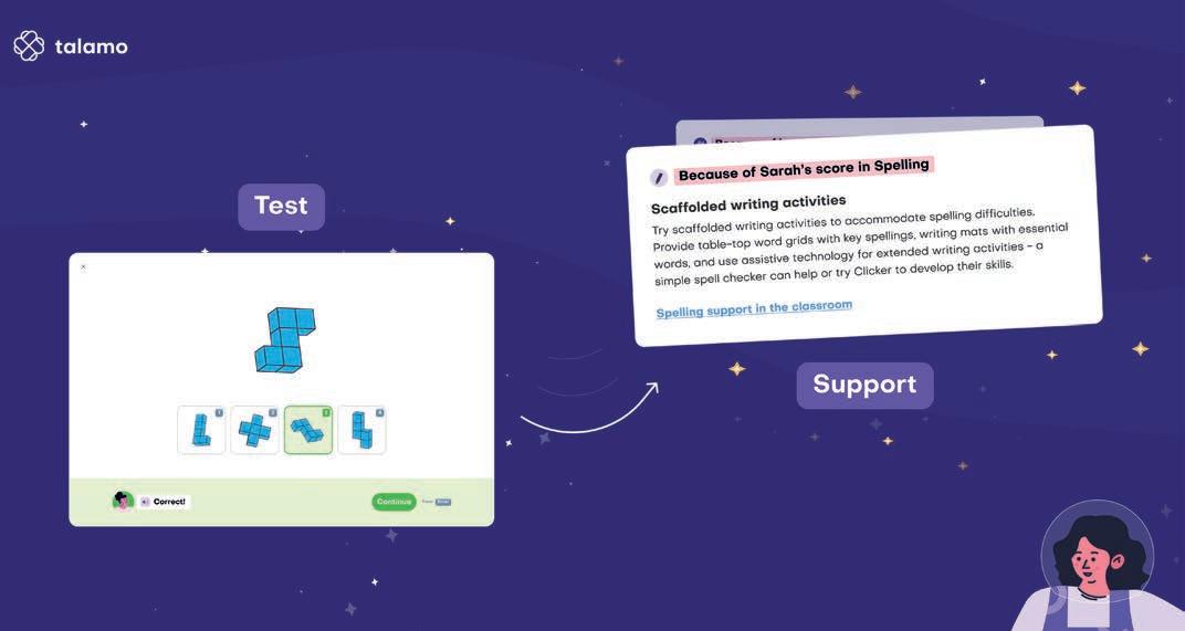 Talamo screening is digital and uses content adapted from formal assessments, including Riverside Insights WoodcockJohnson, with whom Talamo developed a strategic agreement. “We’ve adapted a lot of that test and included some of our material as well.” AI technology enables personalised recommendations.