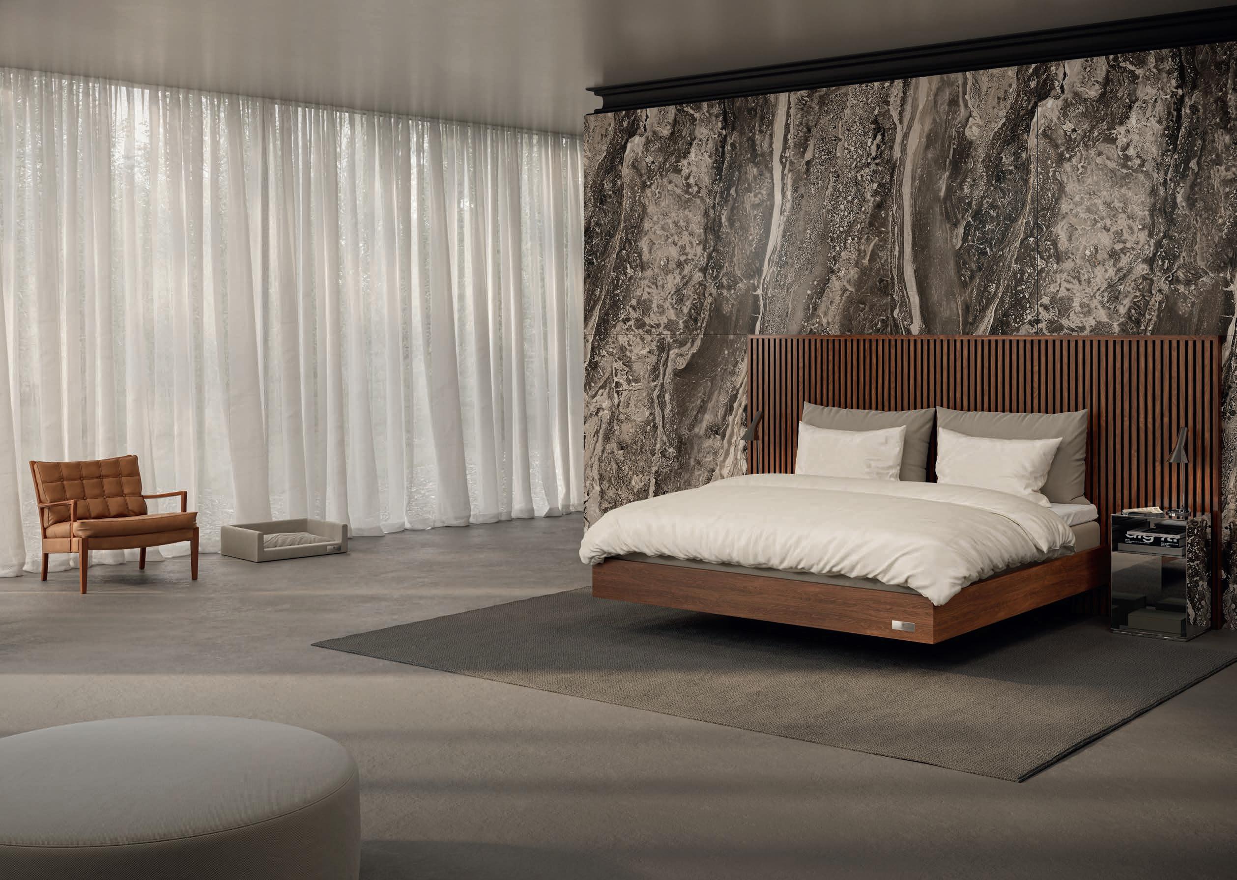 NEW ARRIVAL Bed: Hällsö Walnut I MattressFabric: Kvadrat’s Fjord 0322 I Rug: Hemsedal 2300 I Bed Linen: Vindstilla I Headboard: Pinnö