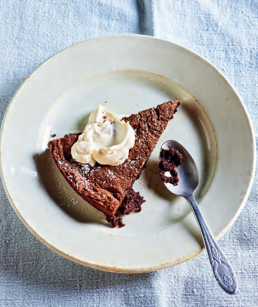 1 Grease a 20cm loosebottomed cake tin. 2 Beat the 150g of butter and sugar till pale, then beat in the egg yolks. 3 Melt the chocolate in a bowl placed over a pan of simmering water. When the chocolate has cooled slightly, add it to the butter mixture. 4 Beat the egg whites until they are stiff and fold them gently into the chocolate mixture. 5 Pour the mixture into the cake tin and bake for an hour at 170°C/Fan 150°C/Gas 3. Leave it to cool in the tin on a rack and, when ready to serve, turn it out and dust it with icing sugar.