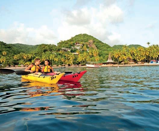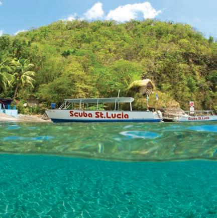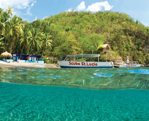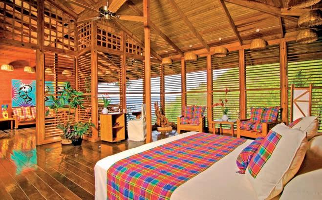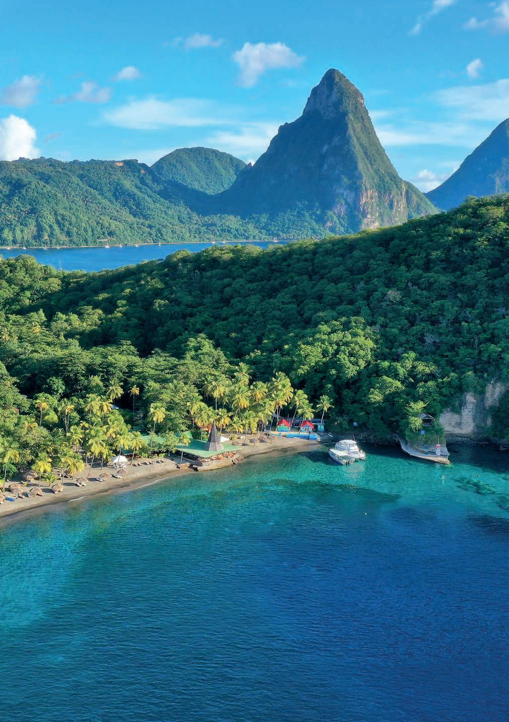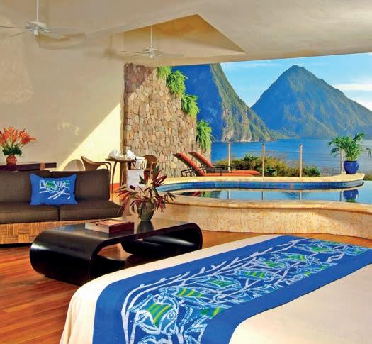 The large bedroom is decorated in vibrant tropical hues and flows seamlessly onto an equally large verandah with fabulous forest and ocean views. There’s no air conditioning but the natural throughdraught makes for perfect ventilation. So we go to sleep to the sounds of the forest and wake up with the sun to the sound of birdsong and distant ocean waves. It’s a beautiful way to wake up and just a short walk down the hill to breakfast. Then it’s all about sun, sea and sand. There’s plenty to see and keep us busy - one of the best snorkelling spots on the island is right here. There’s also paddle boarding, sailing and scuba diving. There are two beaches for some serious lounging, the main one at Anse Chastanet and Anse Mamin, a short walk or boat ride away. The crystal clear, sunshine-warmed water is waiting when we need to cool o , before checking in to our second hotel, Jade Mountain. Jade Mountain rises above Anse Chastanet, overlooking St Lucia’s Pitons - a World