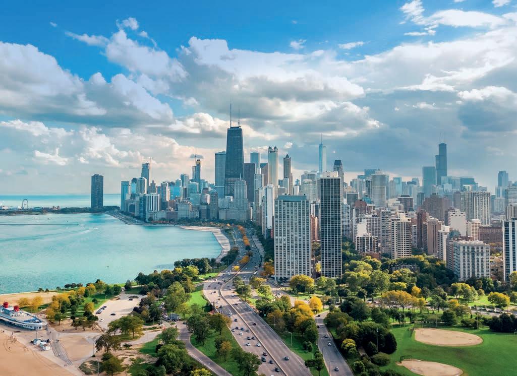 Chicago is the third-largest city in the USA. It sits on the banks of Lake Michigan in the Midwest state of Illinois, a proud testament to triumph over adversity. Devastated by the Great Chicago Fire of 1871, the city has since developed into a sparkling metropolis with its iconic skyline and myriad attractions to explore. Chicago captures the essence of all the positive aspects of urban life. It’s bustling and glitzy, yet it’s also incredibly peaceful with plenty of green spaces and a waterside lifestyle. There’s a restaurant scene to be envied and the di erent neighbourhoods with their contrasting personalities create a dynamic and vibrant spirit that’s contagious.
