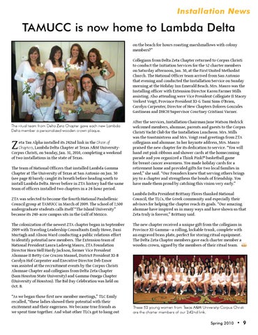 eta Tau Alpha installed its 242nd link in the Chain of Chapters, Lambda Delta Chapter at Texas A&M UniversityCorpus Christi, on Sunday, Jan. 31, 2010, completing a weekend of two installations in the state of Texas. The team of National Officers that installed Lambda Gamma Chapter at The University of Texas at San Antonio on Jan. 30 (see page 8) barely caught its breath before heading south to install Lambda Delta. Never before in ZTA history had the same team of officers installed two chapters in a 24-hour period. ZTA was selected to become the fourth National Panhellenic Council group at TAMUCC in March of 2009. The school of 7,500 undergraduate students calls itself “The Island University” because its 240-acre campus sits in the Gulf of Mexico. The colonization of the newest ZTA chapter began in September 2009 with Traveling Leadership Consultants Emily Howe, Dani Murtagh and Alison Ward conducting a public relations effort to identify potential new members. The Extension team of National President Laura Ladewig Mauro, ZTA Foundation Director Nora Nell Hardy Jackson, former Vice President Alumnae II Betty Coe Cruzen Manuel, District President XI-B Carolyn Hof Carpenter and Executive Director Deb Ensor was assisted at the recruitment events by the Corpus Christi Alumnae Chapter and collegians from Delta Zeta Chapter (Sam Houston State University) and Gamma Omega Chapter (University of Houston). The Bid Day Celebration was held on Oct. 8. “As we began those first new member meetings,” TLC Emily recalled, “these ladies showed their potential with their excitement and their eagerness. We became true friends as we spent time together. And what other TLCs got to hang out