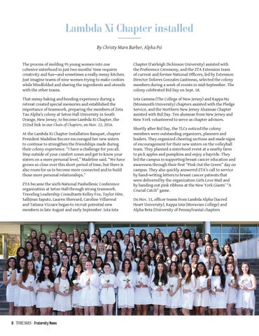 Lambda Xi Chapter installed By Christy Marx Barber, Alpha Psi The process of molding 95 young women into one cohesive sisterhood in just two months’ time requires creativity and fun—and sometimes a really messy kitchen. Just imagine teams of nine women trying to make cookies while blindfolded and sharing the ingredients and utensils with the other teams.