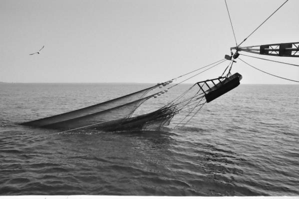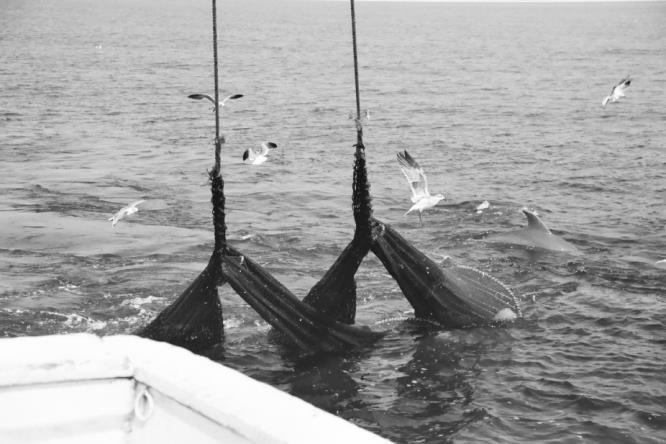 At precisely 6:00 AM, Cap lets down the “wings.” The tall outriggers open like outstretched arms. Massive and weighted green nets attached to the outriggers hit the water with a splash and slowly sink to the sea bottom. Dragging commences. The entire boat shudders and hums with the steady vibration.