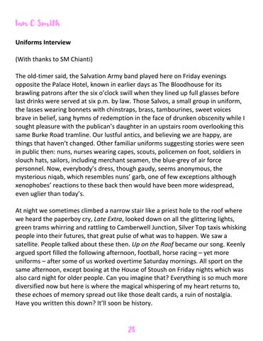 Ian C Smith Uniforms Interview (With thanks to SM Chianti) The old-timer said, the Salvation Army band played here on Friday evenings opposite the Palace Hotel, known in earlier days as The Bloodhouse for its brawling patrons after the six o’clock swill when they lined up full glasses before last drinks were served at six p.m. by law. Those Salvos, a small group in uniform, the lasses wearing bonnets with chinstraps, brass, tambourines, sweet voices brave in belief, sang hymns of redemption in the face of drunken obscenity while I sought pleasure with the publican’s daughter in an upstairs room overlooking this same Burke Road tramline. Our lustful antics, and believing we are happy, are things that haven’t changed. Other familiar uniforms suggesting stories were seen in public then: nuns, nurses wearing capes, scouts, policemen on foot, soldiers in slouch hats, sailors, including merchant seamen, the blue-grey of air force personnel. Now, everybody’s dress, though gaudy, seems anonymous, the mysterious niqab, which resembles nuns’ garb, one of few exceptions although xenophobes’ reactions to these back then would have been more widespread, even uglier than today’s. At night we sometimes climbed a narrow stair like a priest hole to the roof where we heard the paperboy cry, Late Extra, looked down on all the glittering lights, green trams whirring and rattling to Camberwell Junction, Silver Top taxis whisking people into their futures, that great pulse of what was to happen. We saw a satellite. People talked about these then. Up on the Roof became our song. Keenly argued sport filled the following afternoon, football, horse racing – yet more uniforms – after some of us worked overtime Saturday mornings. All sport on the same afternoon, except boxing at the House of Stoush on Friday nights which was also card night for older people. Can you imagine that? Everything is so much more diversified now but here is where the magical whispering of my heart returns to, these echoes of memory spread out like those dealt cards, a ruin of nostalgia. Have you written this down? It’ll soon be history. 28