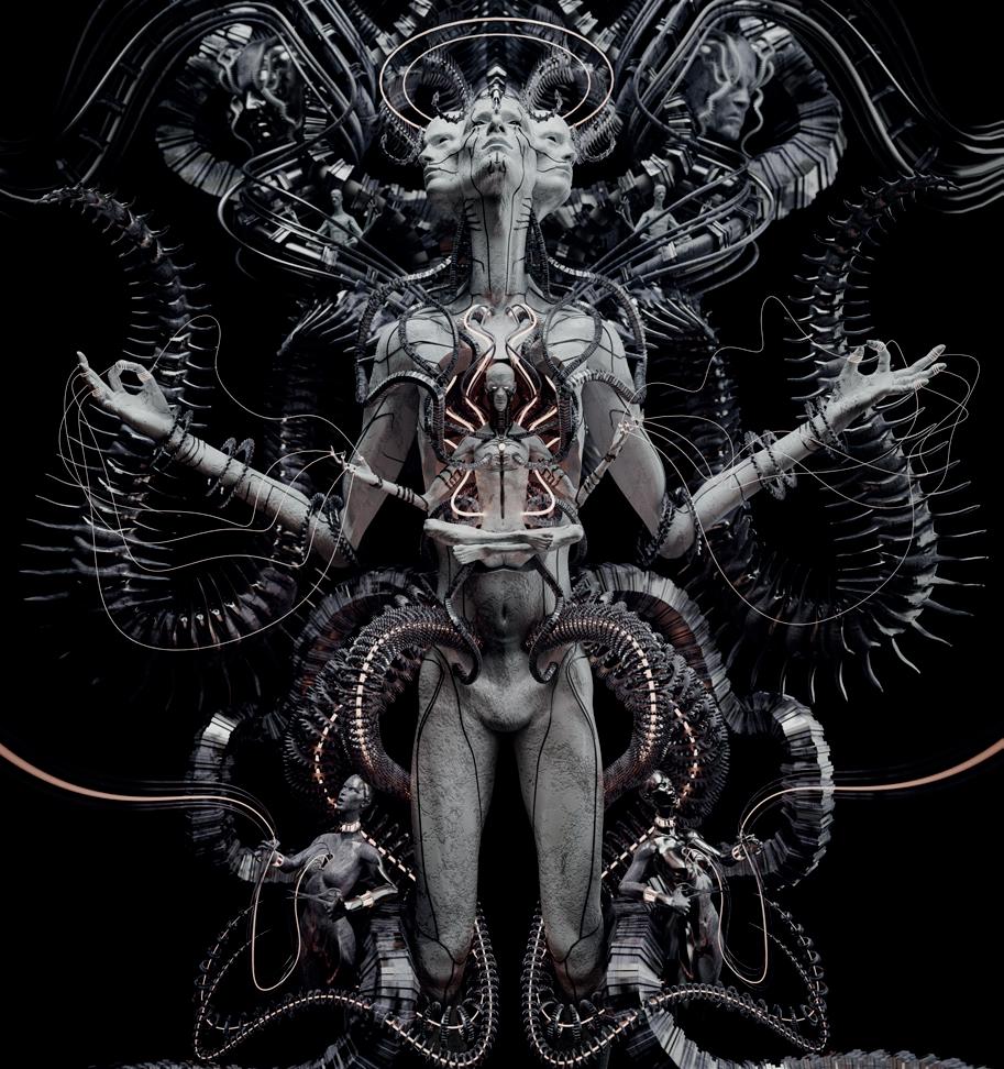 And of course how should it be otherwise H.R. Giger. But also Zdzisław Beksiński, Tsutomu Nihei, Peter Gric and Derek Hess. I began to create work with Photoshop and for the first time slowly immersed mine in the 3d world that never let me go. Today my main work only takes place in Blender 3D and egrush. Photoshop is only used for fine-tuning..