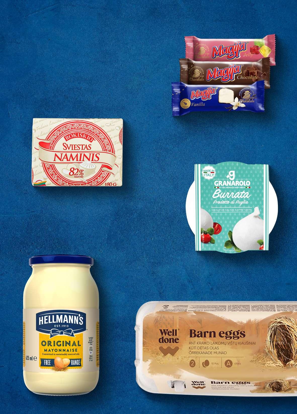Majonezas HELLMANN’S ORIGINAL 73 % rieb., 625 ml 1 l – 4,62 € Ypač maža kaina 5, 79 € € 89 2 %-50 ROKIŠKIO NAMINIS sviestas 82 % rieb., 180 g 1 kg – 7,72 € Ypač maža kaina 2, 69 € € 39 1 %-48 Šviežia burata GRANAROLO** 50 % rieb. s. m., 260 g 1 kg – 5,73 € Ypač maža kaina 2, 99 € € 49 1 %-50 Ant kraiko laikomų vištų kiaušiniai WELL DONE 1 dėž. (10 vnt.) 1 vnt. – 0,13 € Ypač maža kaina 2, 49 € € 29 1 %-48 € 99 0 vnt. 3 Glaistytas varškės sūrelis MAGIJA** 20–24 % rieb., 3 pak. x 45 g 1 kg – 7,33 € Ypač maža AČIŪ kaina 12 rūšių