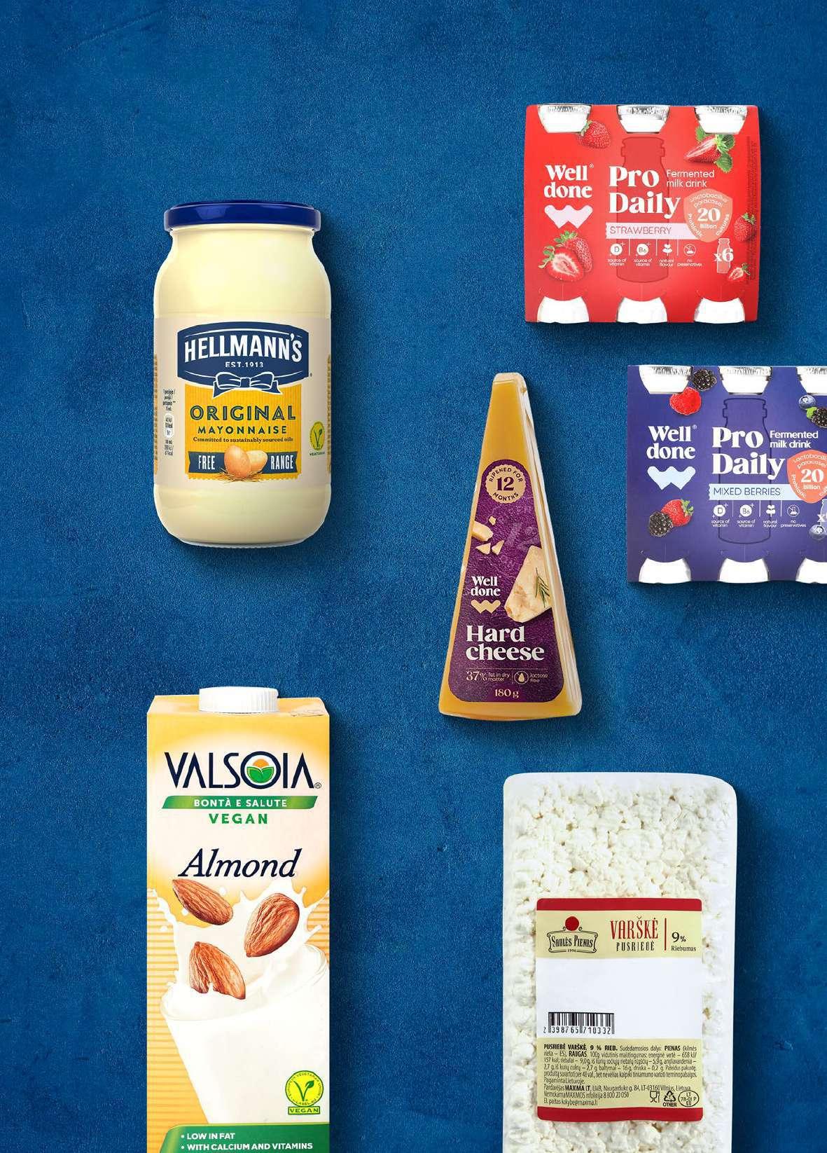 Migdolų gėrimas VALSOIA** 1 l Ypač maža kaina 2, 89 € € 99 1 %-31 Pusriebė varškė SAULĖS PIENAS 9 % rieb., 1 kg Ypač maža kaina 5, 49 € € 99 3 %-27 Majonezas HELLMANN’S** 76 % rieb., 405 ml Ypač maža kaina 1 l – 9,85 € € 99 3 1 l – 5,90 € € 39 2 Kietasis sūris WELL DONE brandintas 12 mėn., 37 % rieb. s. m., 180 g 1 kg – 11,06 € 2, 99 € € 99 1 %-33 Fermentuotas pieno gėrimas WELL DONE** 2 rūšių, 1,5 % rieb., 1 pak. (6 but. x 100 g) 1 kg – 3,82 € 2, 99 € € 29 2 %-23