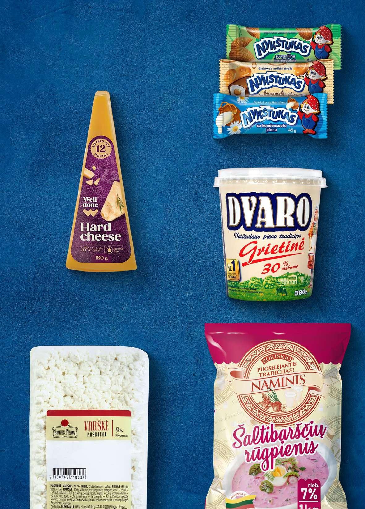 DVARO grietinė 30 % rieb., 380 g 1 kg – 4,97 € Ypač maža kaina 2, 85 € € 89 1 %-33 Kietasis sūris WELL DONE 37 % rieb. s. m., brandintas 12 mėn., 180 g 1 kg – 11,06 € Ypač maža kaina 2, 99 € € 99 1 %-33 Glaistytas varškės sūrelis NYKŠTUKAS** 3 rūšių, 21–23,1 % rieb., 45 g 1 kg – 8,67 € 0, 59 € € 39 0 %-33 ROKIŠKIO NAMINIS rūgpienis 7 % rieb., 1 kg 2, 29 € € 69 1 %-26 Pusriebė varškė SAULĖS PIENAS 9 % rieb., 1 kg Ypač maža kaina 5,49 € € 69 3 %-32