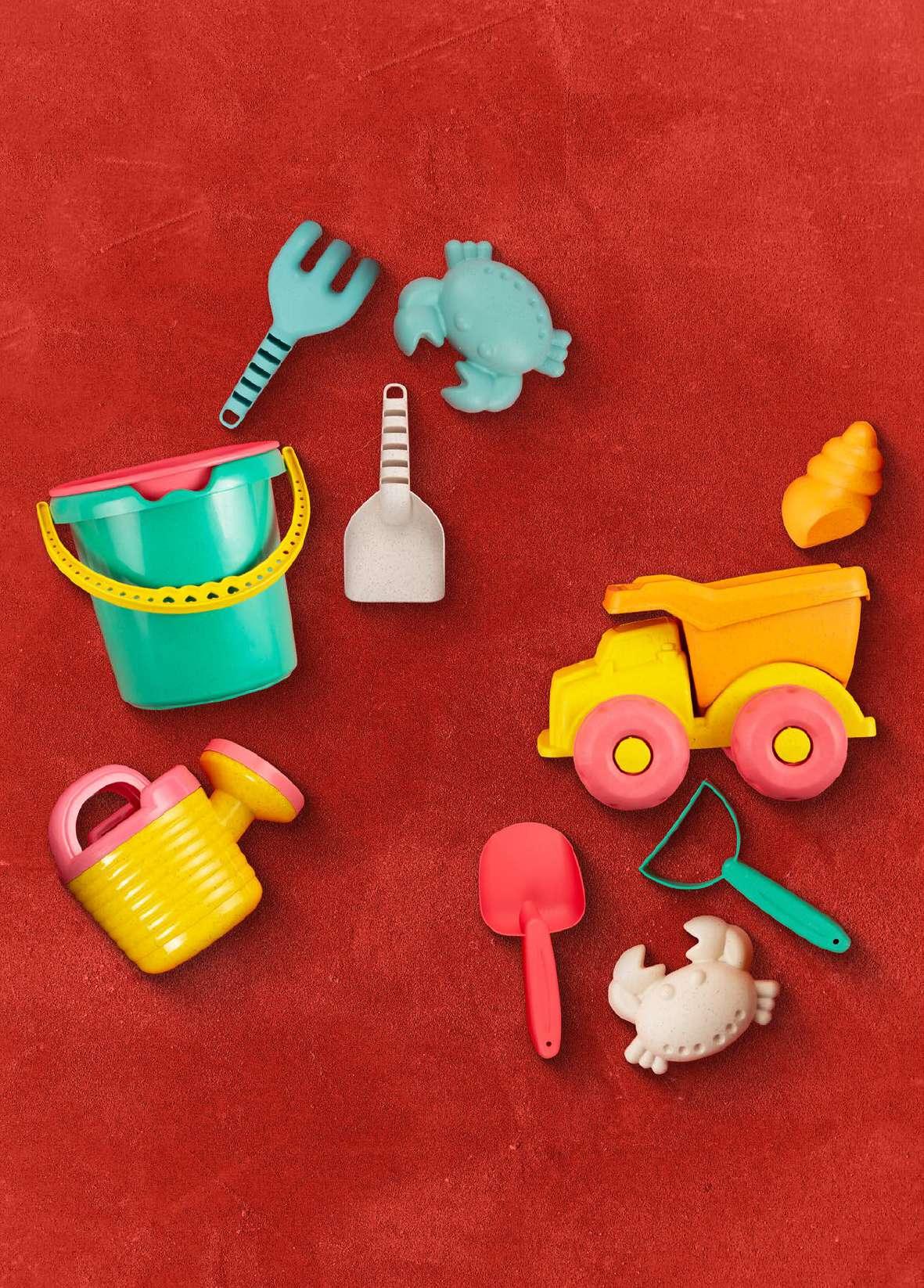 Rinkinį sudaro: kibirėlis, kastuvėlis su grėbliuku, laistytuvas, smėlio sietelis ir formelė.