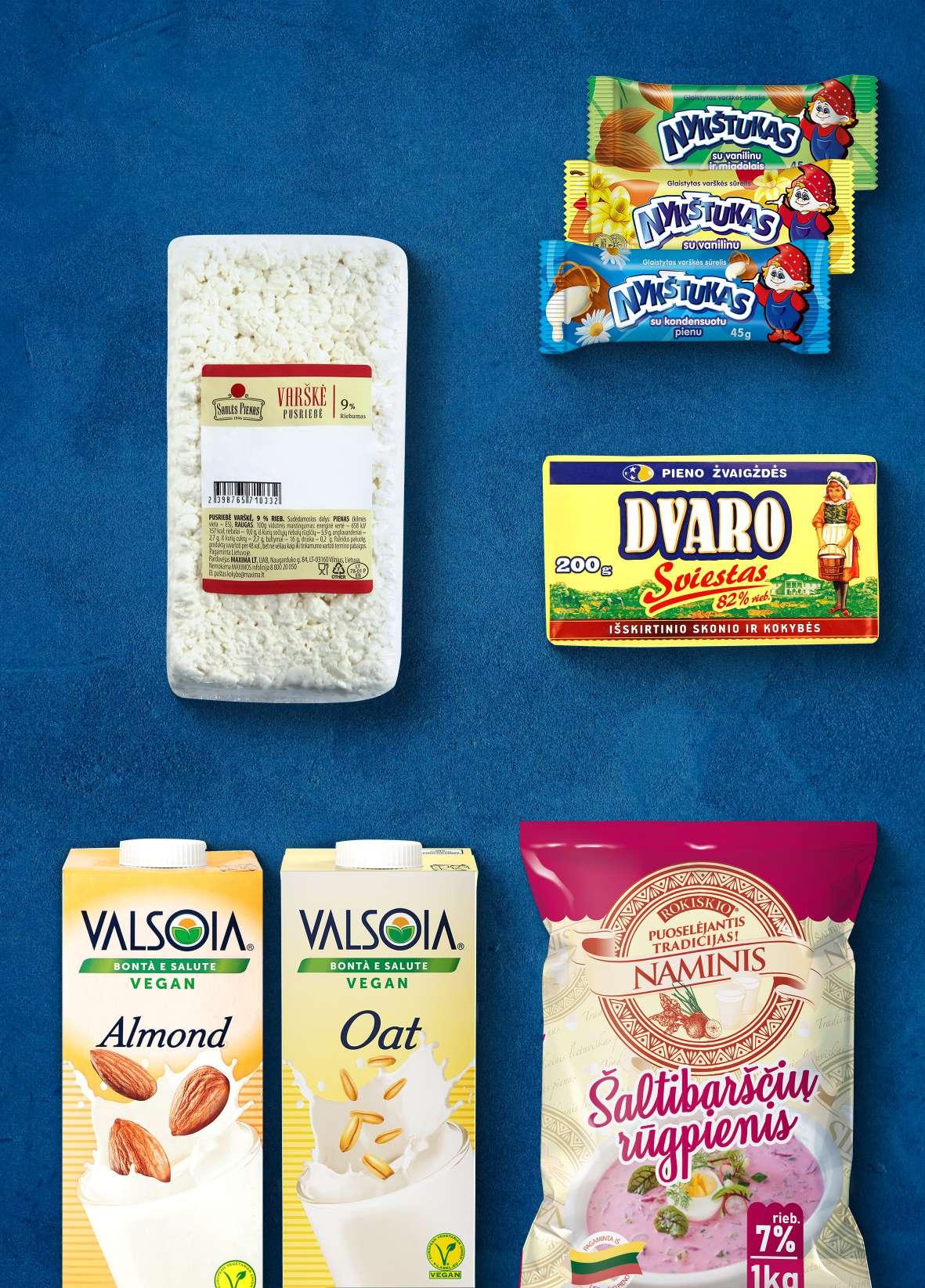 ROKIŠKIO NAMINIS rūgpienis 7 % rieb., 1 kg 2, 29 € € 69 1 %-26 Migdolų; avižų gėrimas VALSOIA** 2 rūšių, 1 l 2, 89 € € 99 1 %-31 Saldžios grietinėlės DVARO sviestas 82 % rieb., 200 g 1 kg – 7,45 € Ypač maža kaina 2, 79 € € 49 1 %-46 Glaistytas varškės sūrelis NYKŠTUKAS 3 rūšių, 21–25 % rieb., 45 g 1 kg – 10,00 € 0, 59 € € 45 0 %-23 Pusriebė varškė SAULĖS PIENAS 9 % rieb., 1 kg 5, 49 € € 99 3 %-27