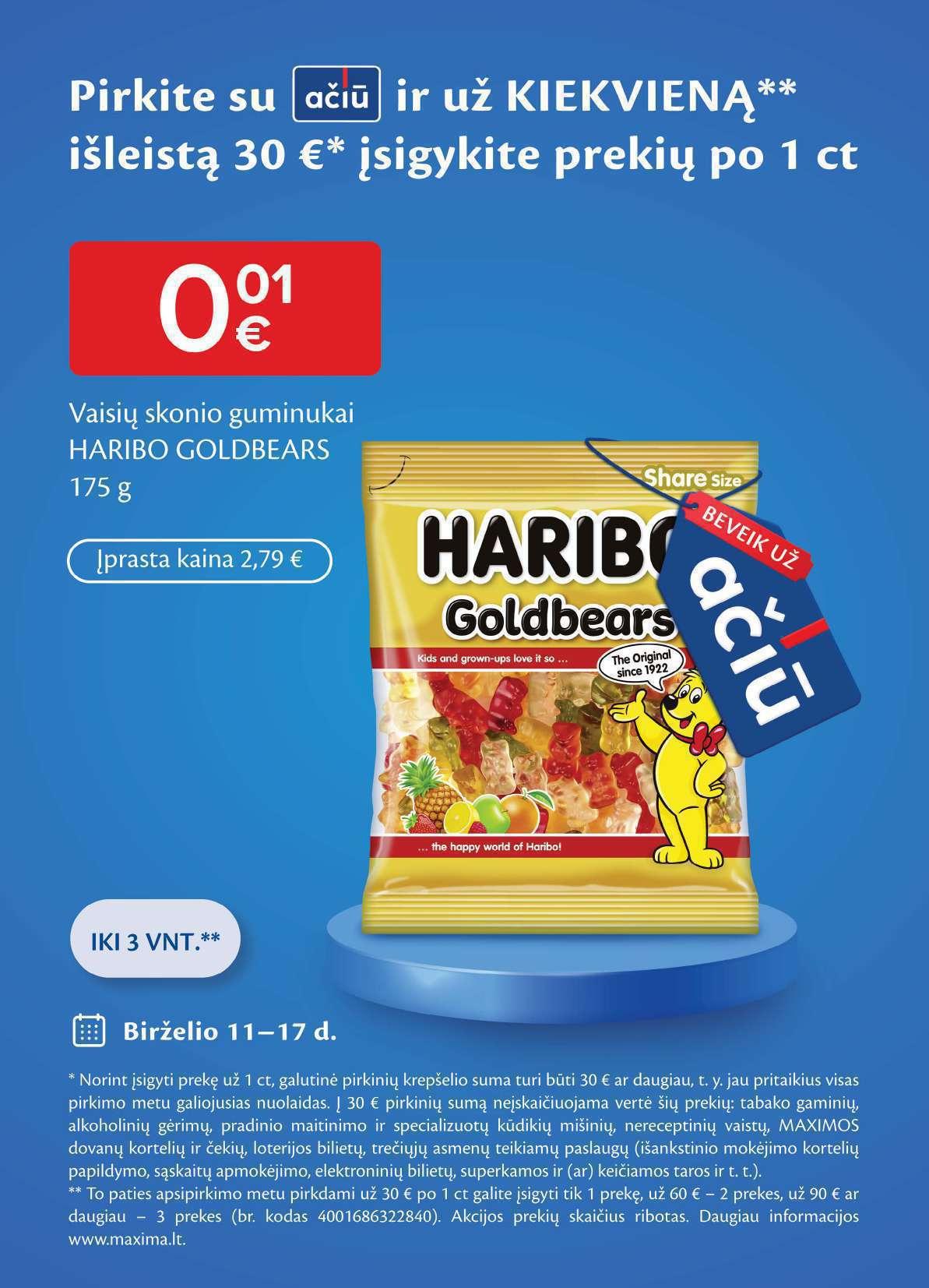 Atsiskaitymas telefonu AČIŪ kortelė telefone Programėlė, kuria naudotis apsimoka Pasiūlymai galioja bir želio 11–17 d. Nuolaida bus suteikta, jei pasiūlymą aktyvinsite programėlėje MAXIMA ir skenuosite kasos ekrane esantį QR kodą . Tik su programėle Tik su programėle Tik su programėle Tik su programėle 9 Raikytas MAMOS batonas** 500 g 1 kg – 1,90 € 1, 19 € € 95 0 %-20 GARDĖ SIO sumu štinių duona** 500 g 1 kg – 2,58 € 1, 59 € € 29 1 %-18 Kvietinė raikyta duona GOJA** 500 g 1 kg – 2,78 € 1, 75 € € 39 1 %-20 Šviesi ruginė raikyta PALANGOS duona** 700 g 1 kg – 1,93 € 1, 69 € € 35 1 %-20 KLAIPĖDOS plikyta raikyta tamsi duona** 800 g 1 kg – 1,74 € 1, 89 € € 39 1 %-26 Itališka duona LORIANA LA PIADINA** 2 rūšių , 300–350 g 1 kg ≥ 6,54 € 2, 89 € € 29 2 %-20 Tra škū s sūrio gabaliukai DELICHE** 45 % rieb. s. m., 2 pak. × 35 g 1 kg – 35,57 € € 49 2 vnt.2 Sausainiai KINDER CARDS** 2 pak. × 1 dėž . (3 vnt. × 25,6 g) 1 kg – 28,58 € € 39 4 vnt.2 2 rūšys Plombyras ragelyje WELL DONE** 2 pak. × 90 g 1 kg – 9,39 € € 69 1 1 + 1 Virta SAMSONO PANERIO dešra** a. r., 2 pak. × 330 g 1 kg – 5,89 € € 89 3 1 + 1