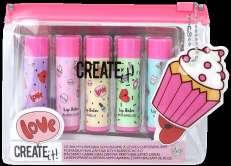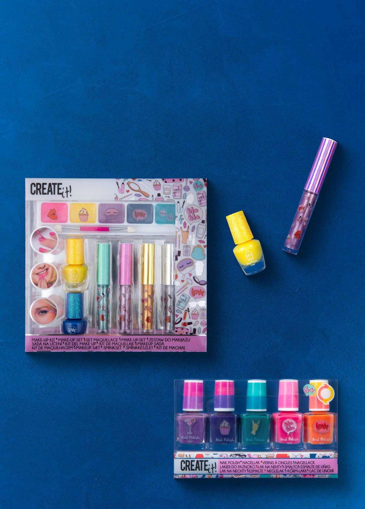 Rinkinį sudaro: 4 vaisių kvapo lūpų blizgiai, 2 nagų lakai, įvairių atspalvių kreminiai akių šešėliai.