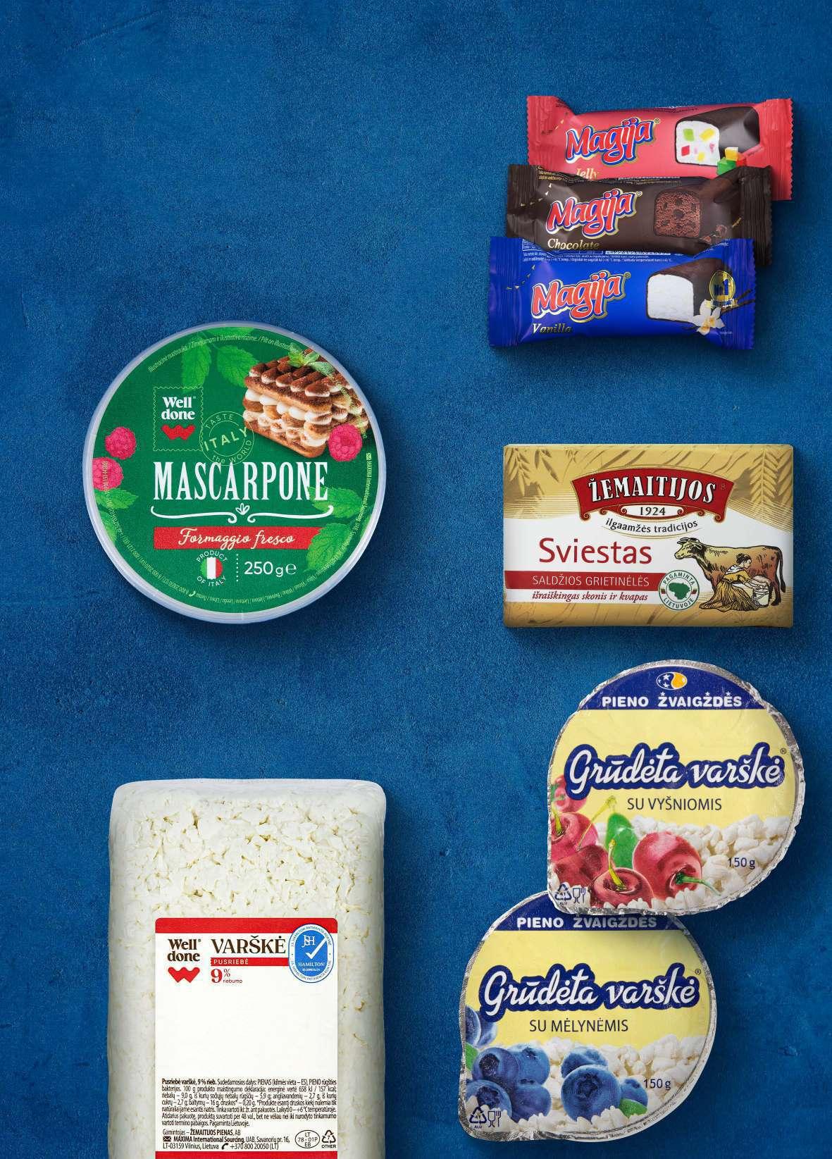 PIENO PRODUKTAI, pilni skonio ir gardumo Glaistytas varškės sūrelis MAGIJA** 14 rūšių, 20–24 % rieb., 3 vnt. × 45 g 1 kg – 9,56 € Ypač maža kaina € 29 1 vnt. 3