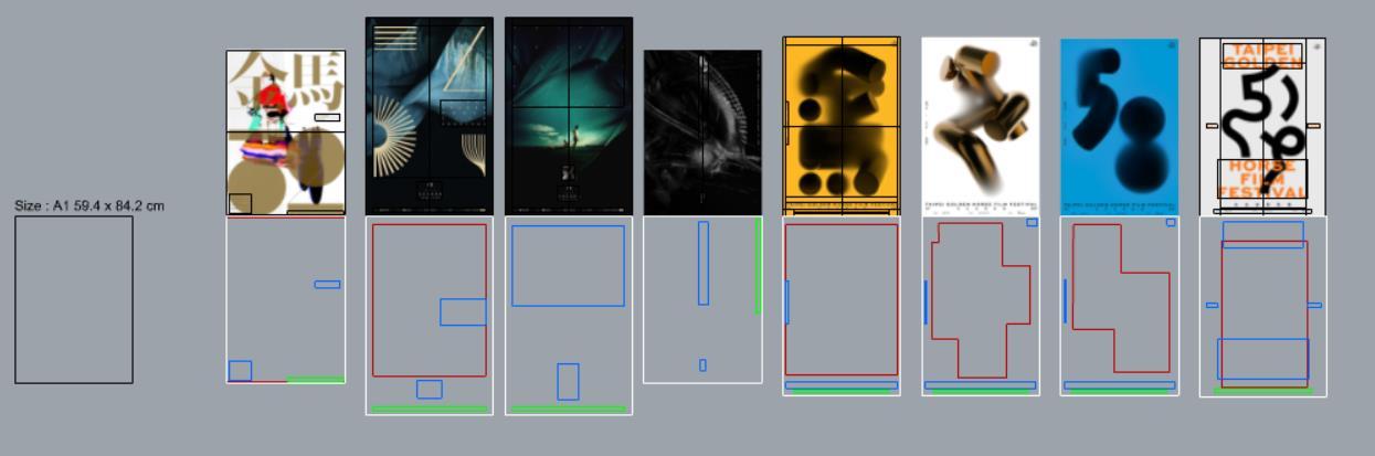 To begin with, I classify the past Golden Horse posters into blocks within Rhino and predefine the desired poster format. The segmented poster areas will be calculated using ReLU and genetic algorithms, considering factors such as area, aspect ratio, and relative positioning. In the color regression analysis segment, I utilize the SL Agent in Pug to systematically dissect and analyze it.