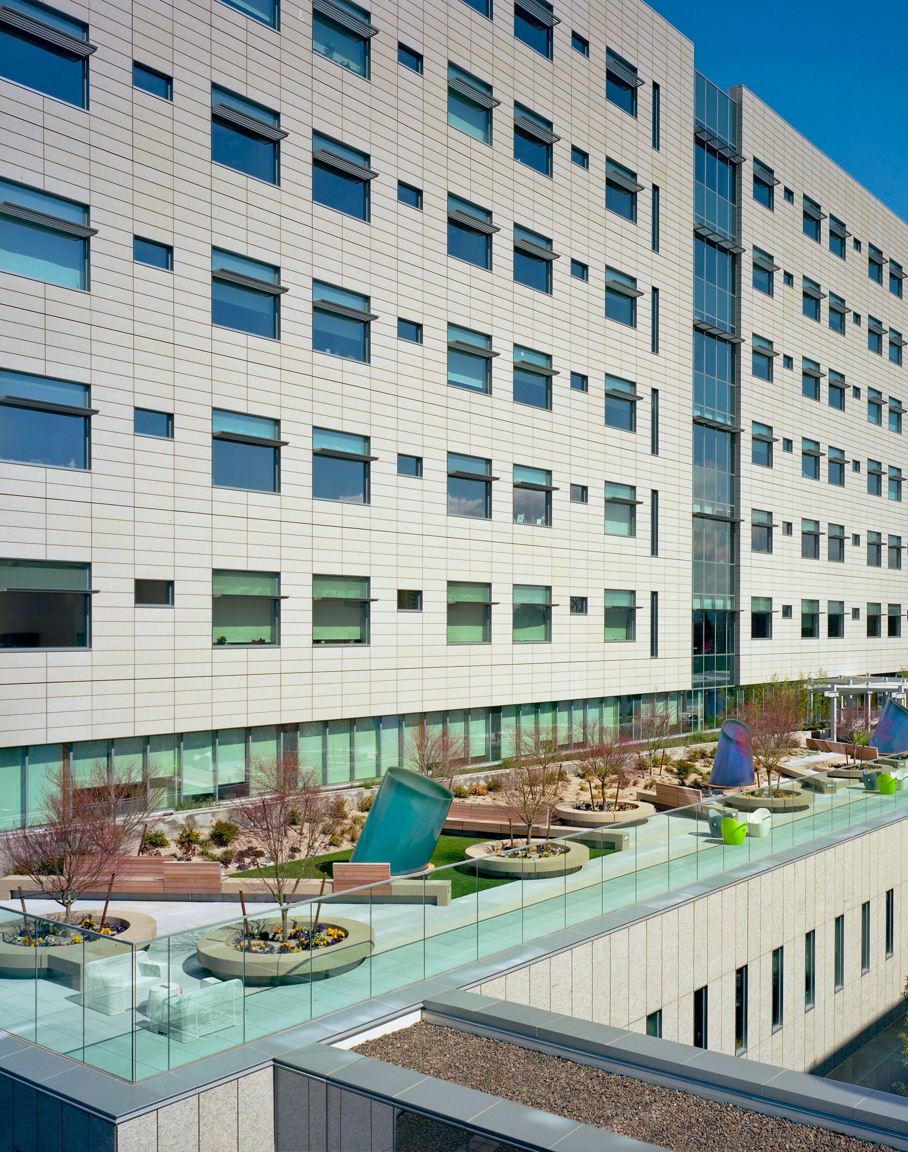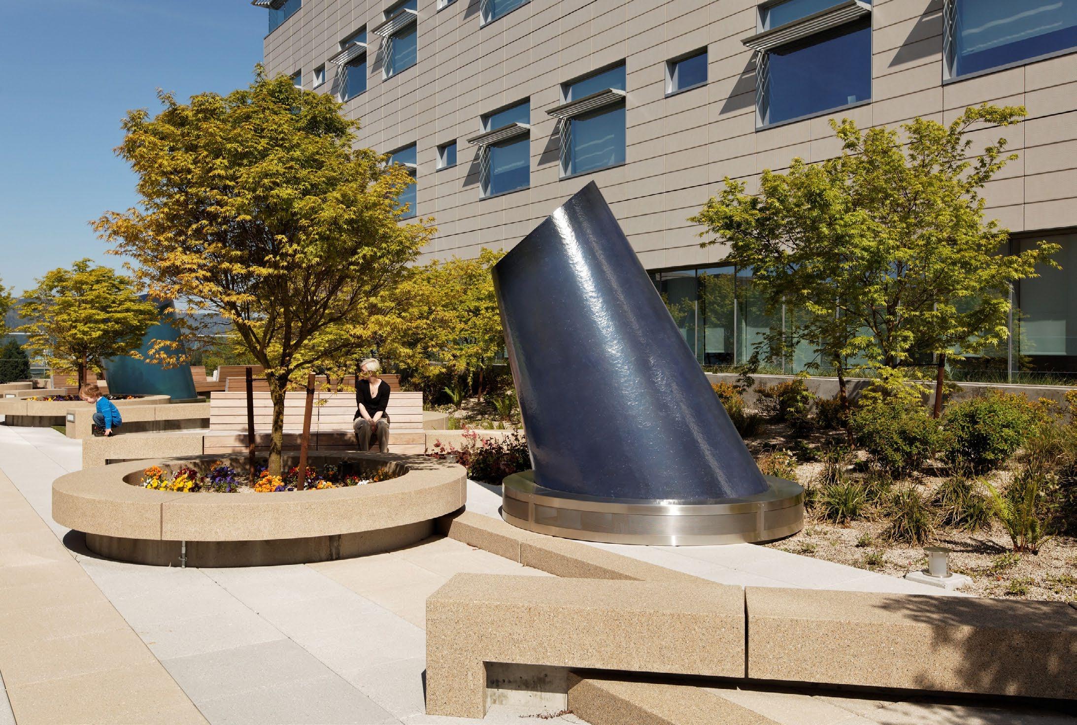 A number of creative storm water strategies have been incorporated into the landscape design to collect and filter storm water runoff before it enters the municipal system. Flow-through planters along the landscaped walkway between the parking structures collect and slow rain water, directing it to a sculptural stone basin. At the terrace garden, rainwater from the canopy is collected and delivered through a spout where it trickles into a tall stone urn, creating an ethereal water display. Rainwater from the roof of the patient tower is delivered to the ground level; during peak rainfall, pressure allows the water to spout in graceful arcs from a planter near the building entry or from a stone column in the courtyard. Indigenous plantings reduce irrigation needs; Astroturf is utilized for the lawn. A “smart system” for irrigation, tied to actual weather data, triggers irrigation only when needed.