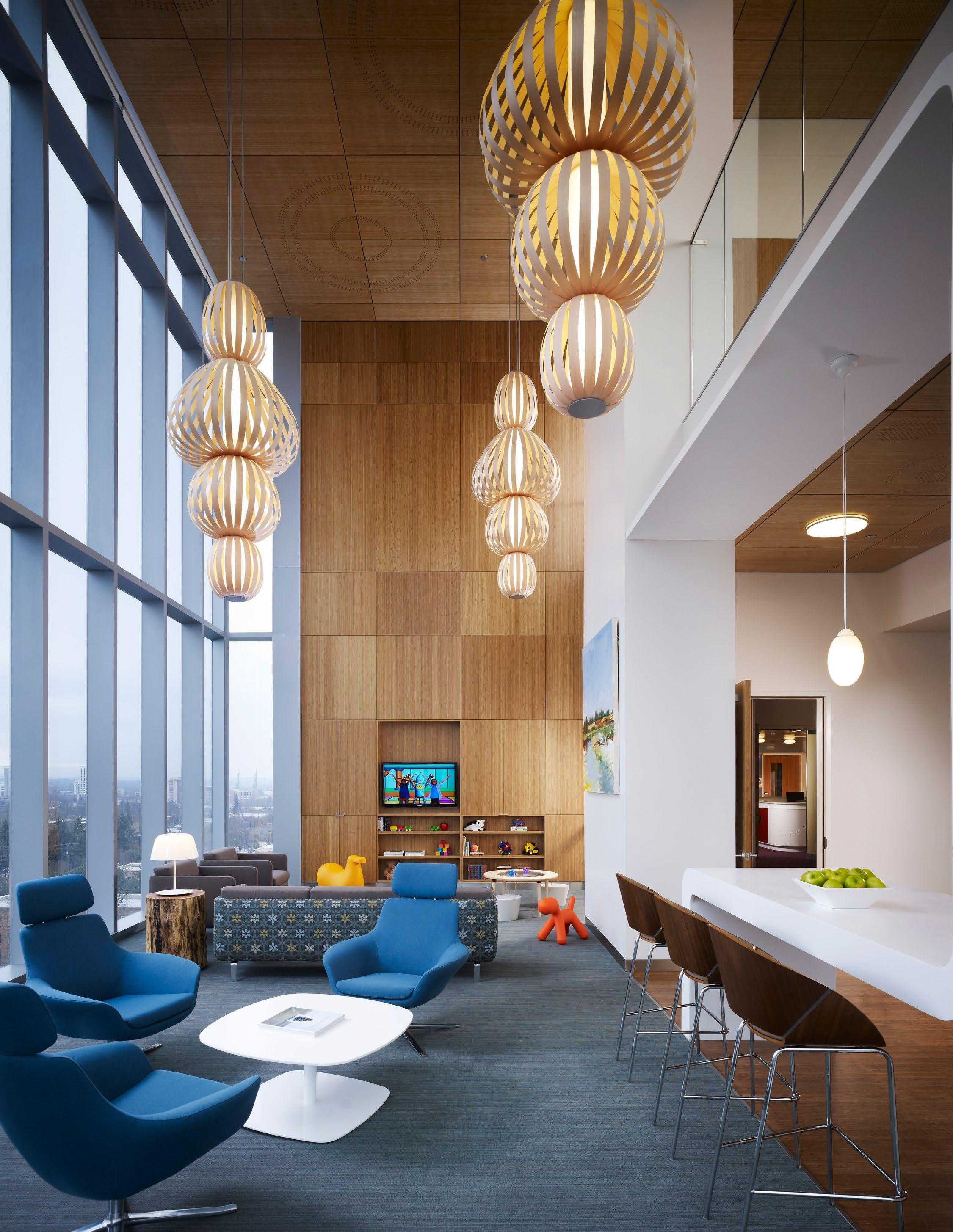 • The patient floors have two-story family lounges that provide patients and their families a place for respite and relaxation. These glass-enclosed lounges offer excellent views and feel open, spacious and bright. Designed to mimic a home environment, the lounges provide a place where families might gather to share a meal, watch a movie or work on a computer.