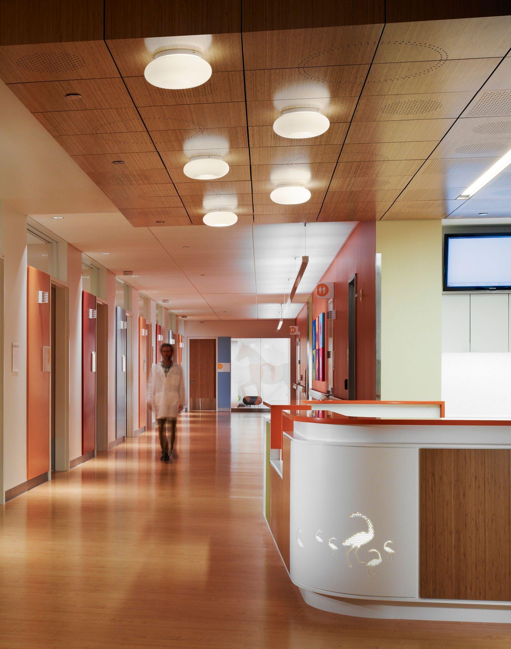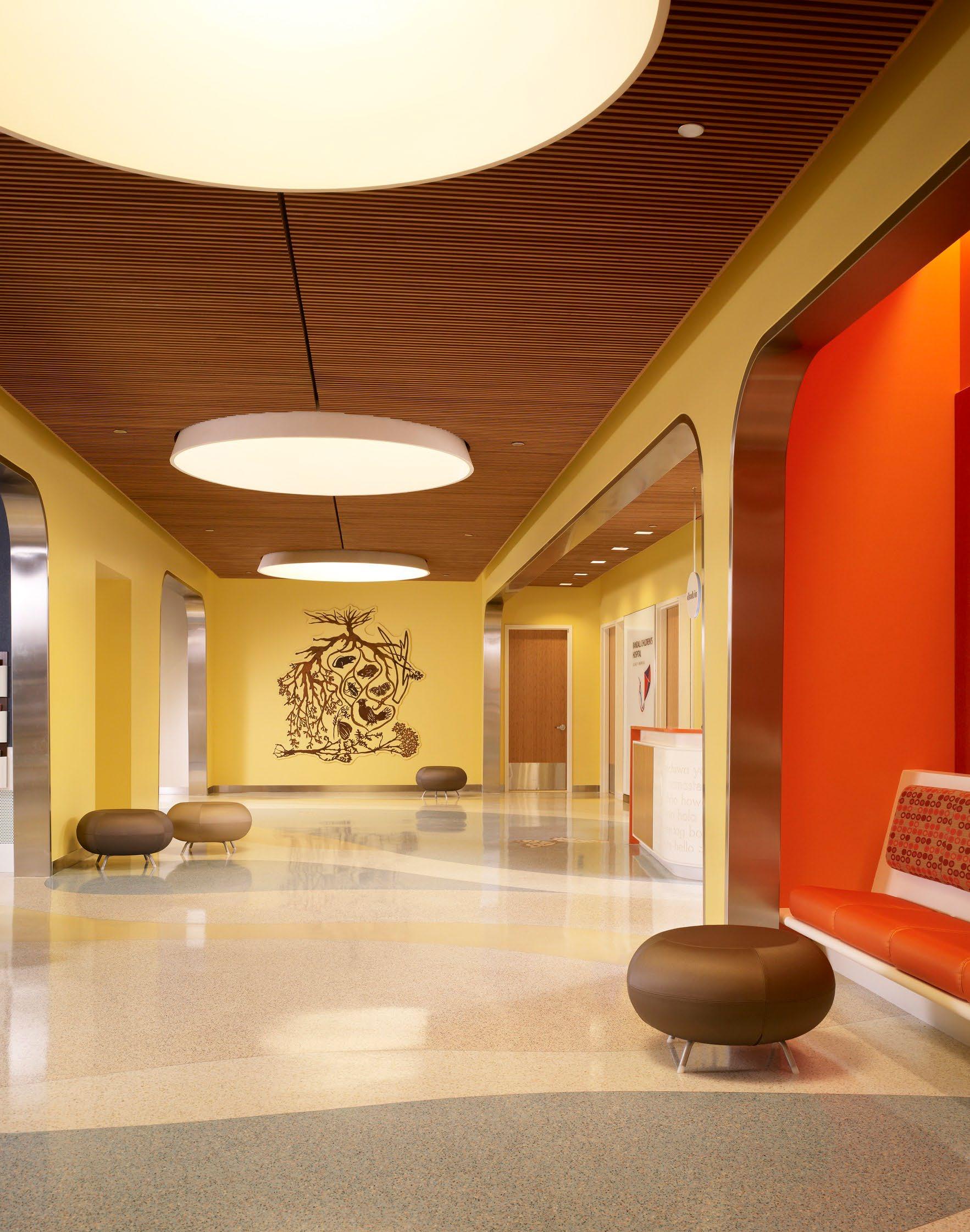 • The use of curves and soft edges is manifested throughout the hospital, reinforced by patterning inspired by games and objects that are familiar to children. For example, the ED waiting room has curved built-in bench seating and the patient floors have carpets with circular patterns, round light fixtures and a custom circular pattern that repeats on the wood ceilings.