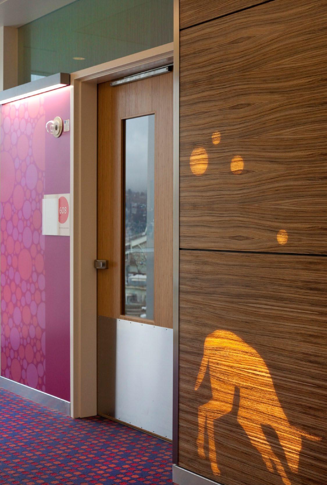 • Four regionally-inspired color palettes for interior finishes are used throughout the hospital to represent the geographic regions served by the hospital: the Willamette Valley, Cascade Range, Oregon Coast, and Desert. The palette applied relates to the function of the space; for example, the NICU reflects the tranquil Coast palette while the ED uses the more active desert palette. Moreover, each hospital floor is assigned an animal found in its region and that animal is repeated in environmental graphics throughout the floor, with a variety of materials. These animals are first introduced in the frieze in the hospital entry lobby. On the patient floors these animals are incorporated into custom art glass; for example, Zebrano wood light boxes serve as a night light, and in more surprising places, animals appear at the eyelevel of a toddler standing at a nurse’s station. Each patient room is identified with a colored panel that incorporates patterning inspired by the unit palette. The combination of regional color palettes and animal imagery provides an integrated system that also assists in wayfinding and in establishing a graphic identify for the new hospital.