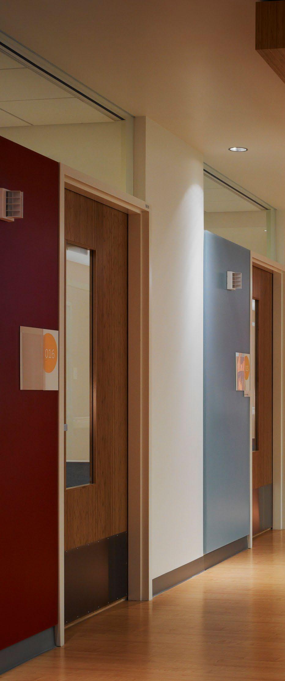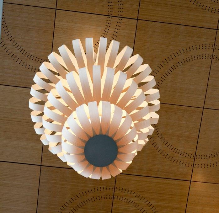 • Careful thought was also given to the selection of materials used, such as bamboo doors on patient rooms and entry doors to provide a non-institutional quality unlike that of a typical hospital. A number of custom-designed elements and furnishings, such as the sculptural, wood pendant light fixtures, are incorporated throughout.
