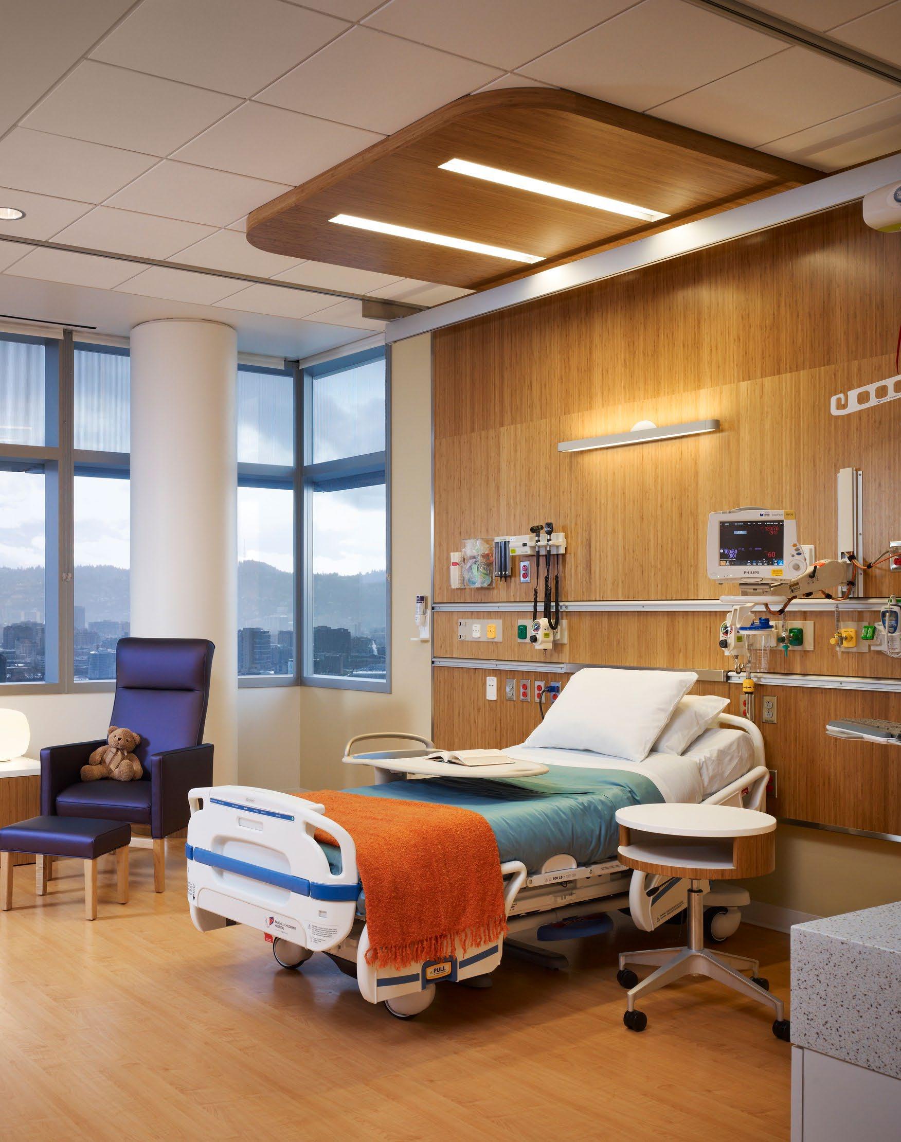 The patient rooms all feature expansive 10-foot ceilings which create a sense of volume while providing enough space for a clerestory light into the corridor, directing more natural light into the core of the building. Patient rooms have large windows which frame city and mountain views. A bamboo headwall with a curving wood canopy over the bed is meant to mimic a “canopy” bed, providing a comforting enclosure around the child. Patient bathrooms are located “mid-board,” or between the rooms, enabling rooms to have a rectangular shape, more similar to that of a patient’s bedroom at home. Sliding doors into the bathroom are made of colored glass and a large photograph of a nature scene, adding visual interest and art elements in the patient room.