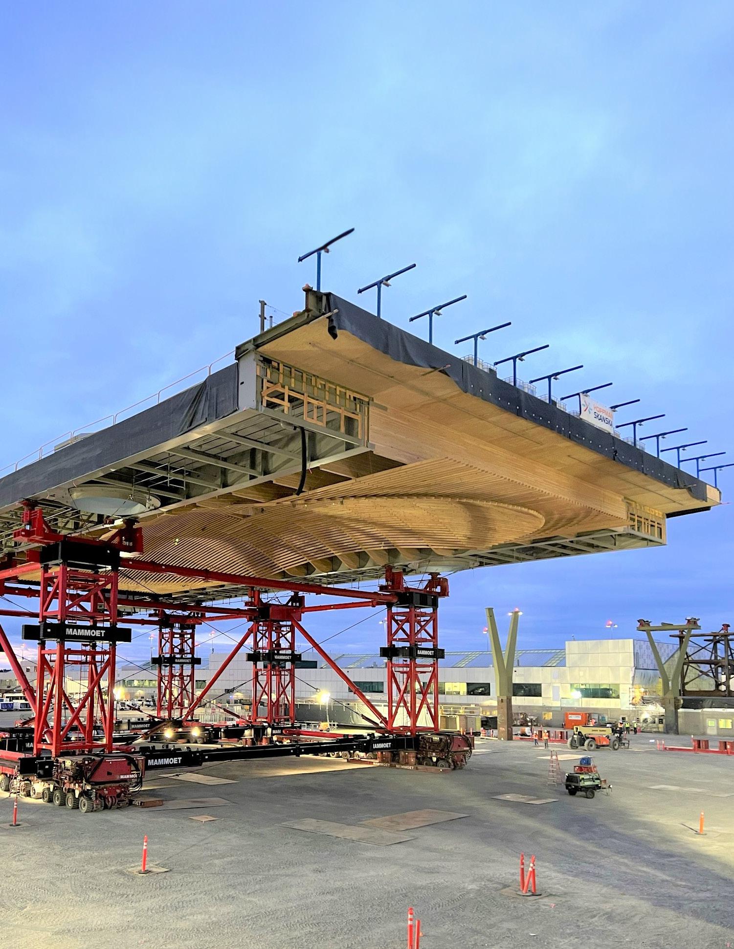 The cassettes were then installed over a 3 ½ - month period – from late August to mid-December 2022 – during an FAA-regulated window at night when there were no passengers or occupants below the construction area. Crews first lifted the cassettes to the height of their final elevation of 53 feet. They were then driven from the prefab yard to the terminal by giant transformers. The final step was sliding them into place over the existing terminal and setting atop the Y columns. With the new roof in place, construction of the reimagined terminal continues below where workers are shielded from outside elements.
