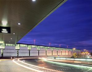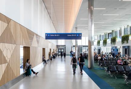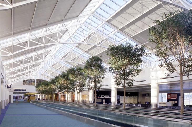 The choice of wood for the massive roof structure is supported by research as “warm, inviting, comfortable, and relaxing.” The abundance of living landscape – 72 large trees, up to 25’ tall, cascading gardens, and over 5,000 plants –is strategically placed throughout the terminal to provide stress relief from beginning to end of a passenger’s journey.