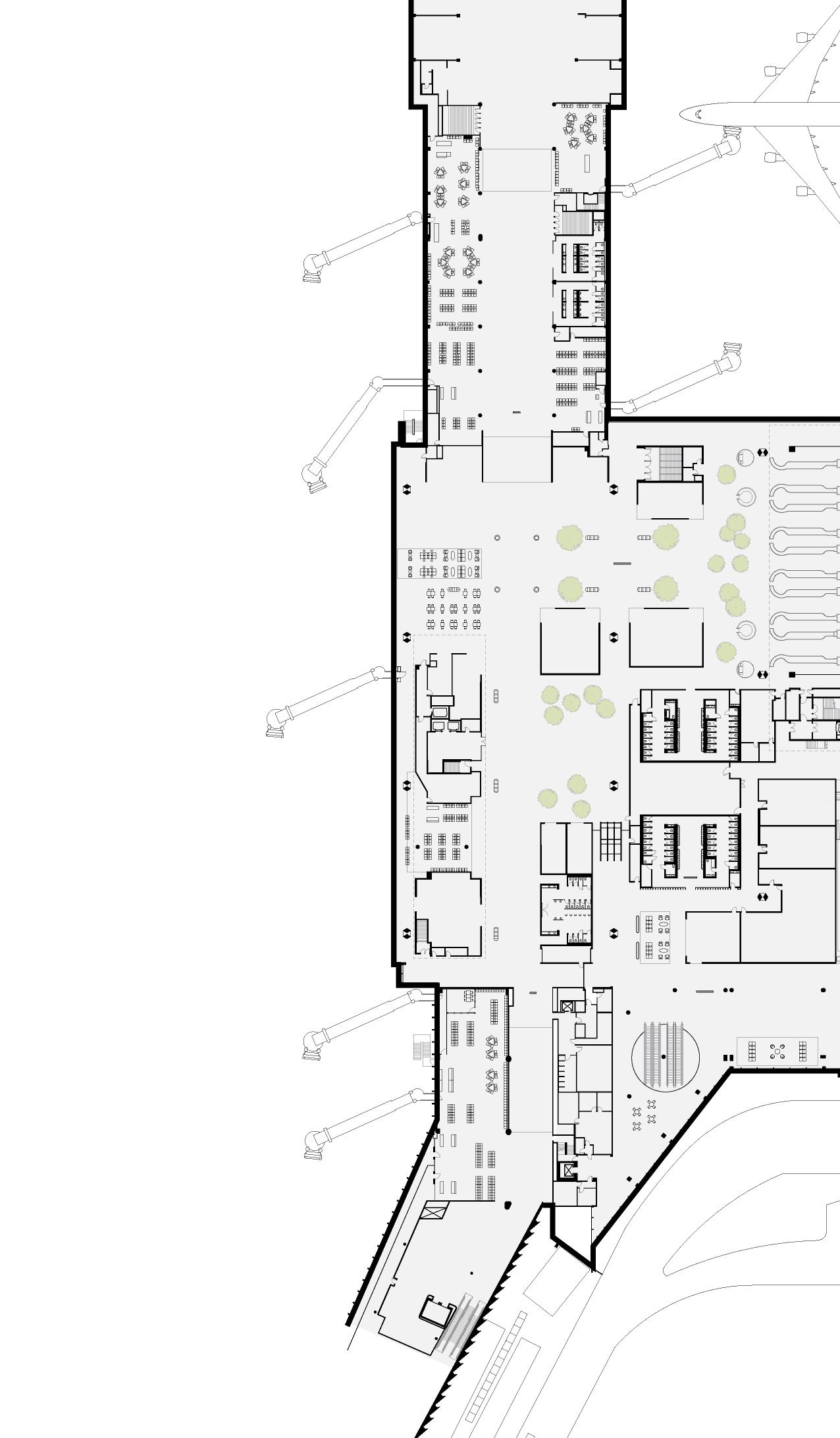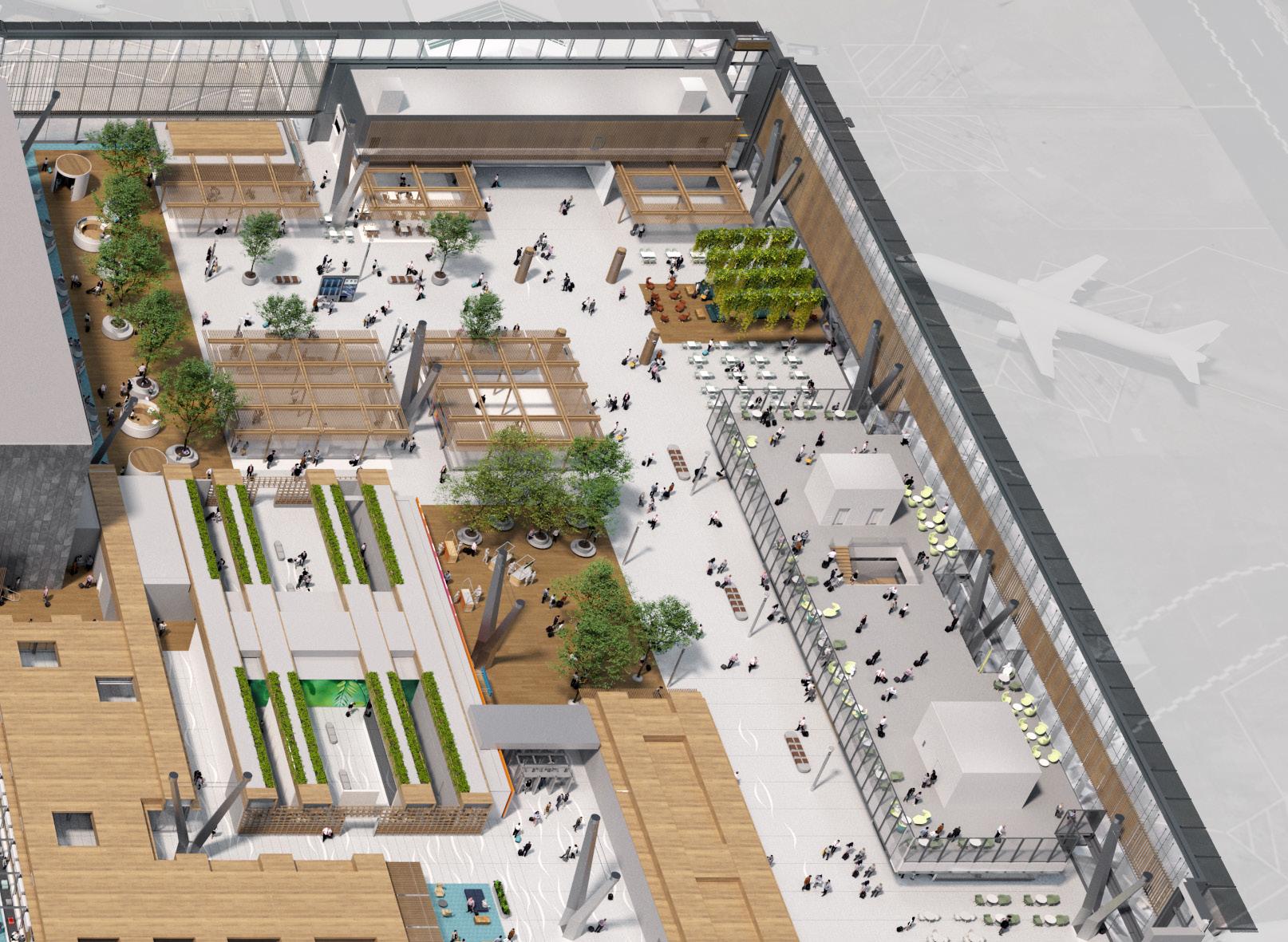 Passengers step into the vibrant spirit of Portland when they land. An inviting Arrival Garden path leads straight to baggage claim. Loved ones are reunited under dense green hanging gardens marking the exits beyond.