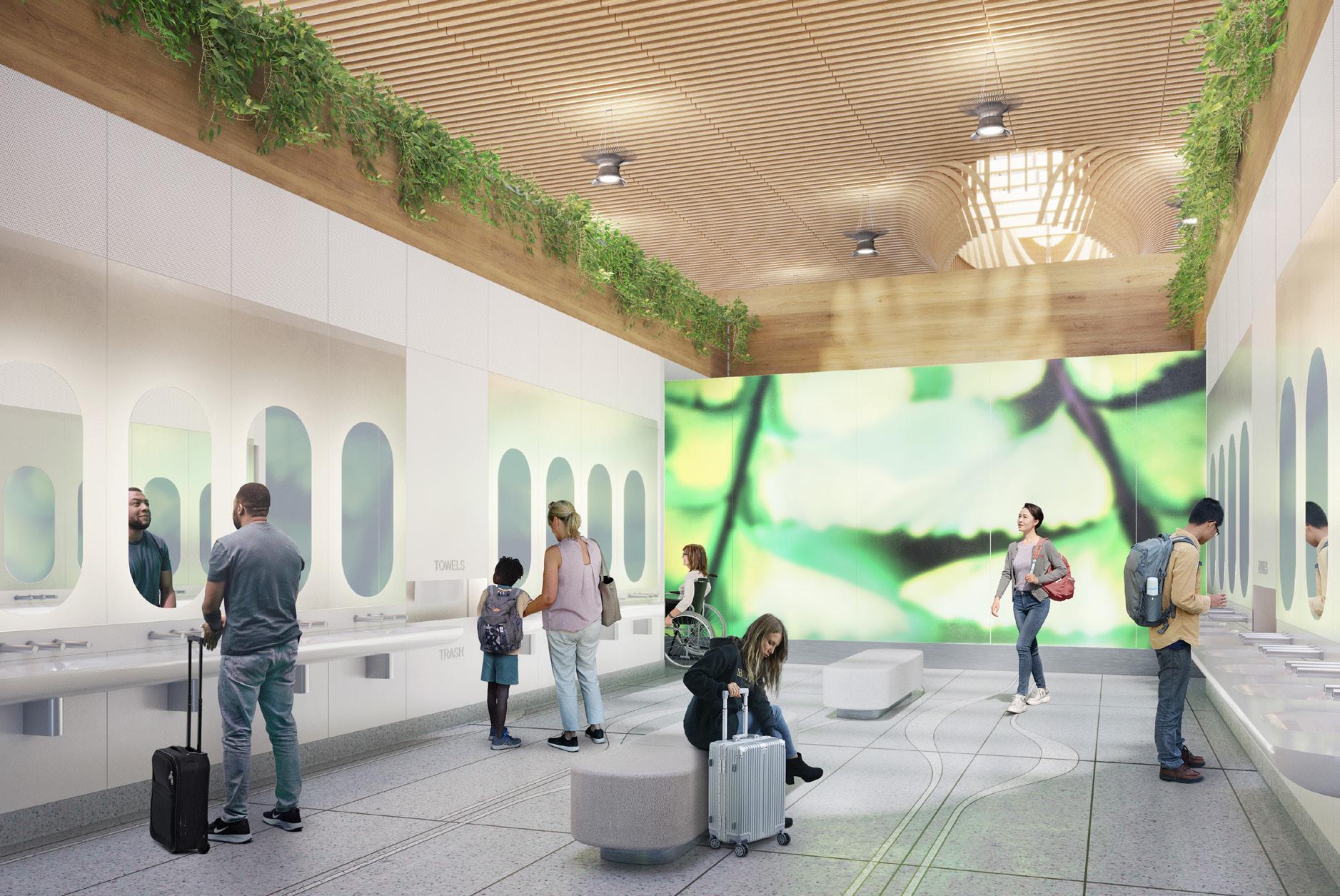 There are 4 main banks of restrooms in the highly trafficked project spine that have been identified as All-User, meaning universally all-inclusive. Traditional restrooms remain throughout the airport to accommodate all comfort levels. A variety of spaces are incorporated—including universal stalls, family rooms, lactation rooms, baby changing stations, adult changing—all providing different levels of privacy and access points.