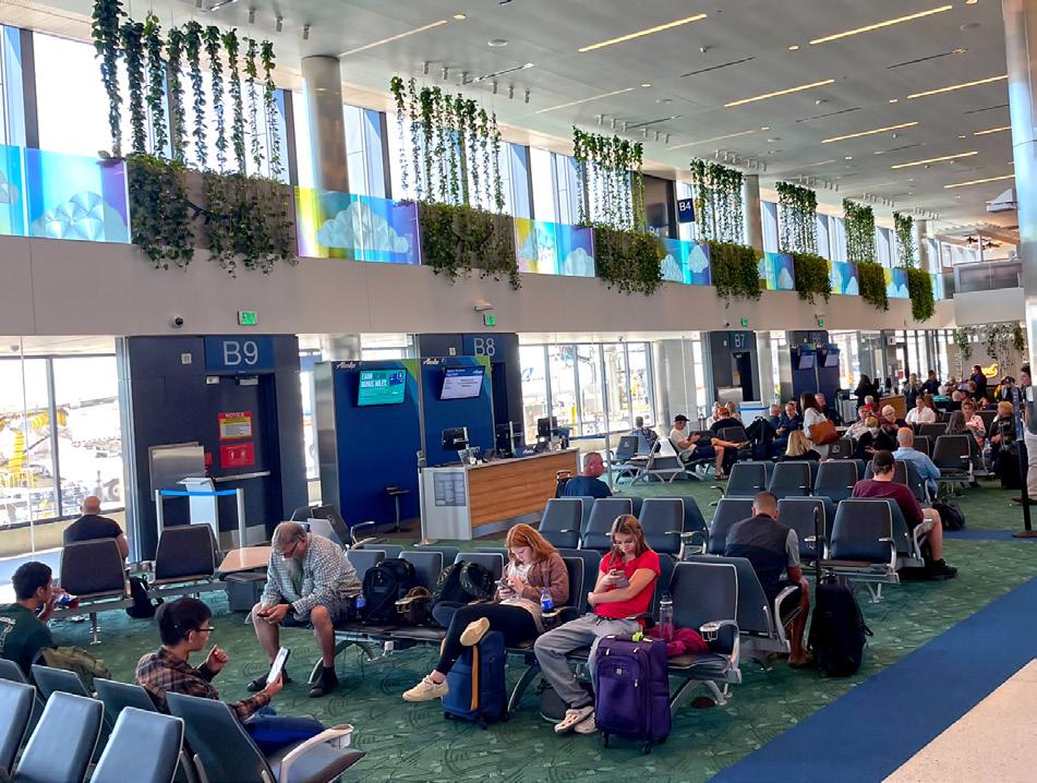 Passengers move from ticketing into a “seam” of lush interior landscaping, evoking a walk through a Pacific Northwest forest, while signaling the way to security checkpoints.