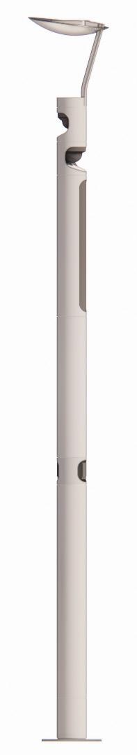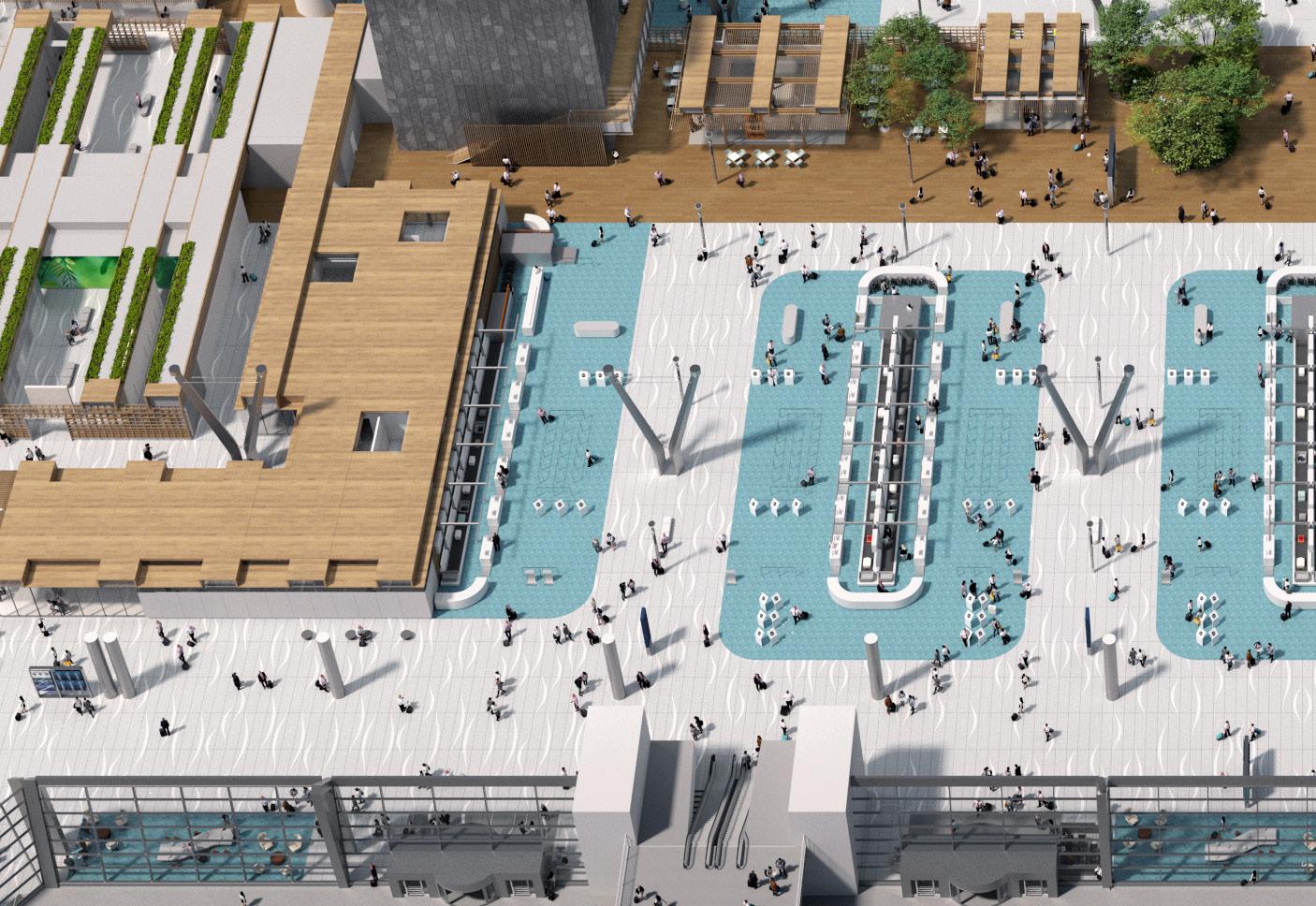 The poles are modular and able to accommodate any combination of elements. Over 50 poles are located along all circulation paths, every 25-50 feet, depending on required services. The poles fit within other “urban furniture,” such as benches and planters, situated along the streetscape-inspired circulation pathways. This innovative concept allows for the integration of technology without dependence on walls or ceilings, offering better coverage and a more permanent infrastructure solution.