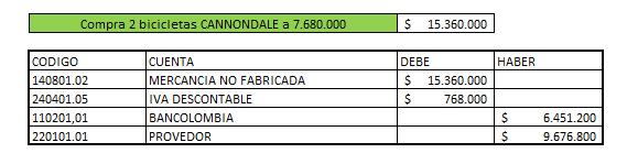 3.4 Abril 10, Compra 2 bicicletas CANNONDALE a 7.680.000 más IVA c/u, a Milán SAS empresa Gran Contribuyente, pago 40% contado y saldo a 60 días.
