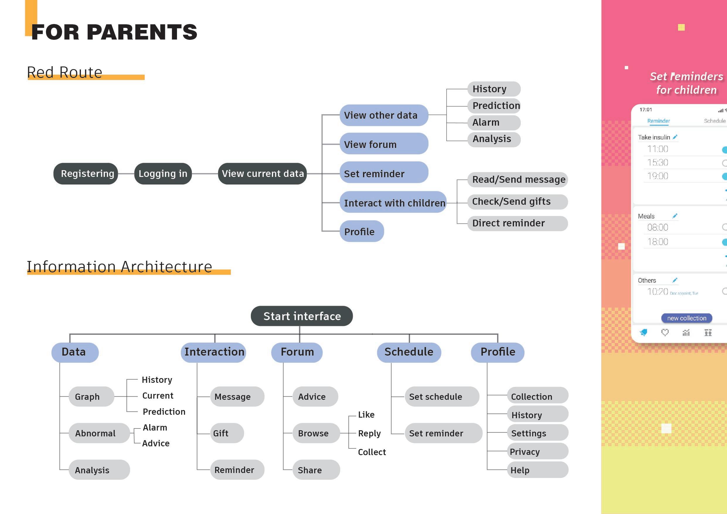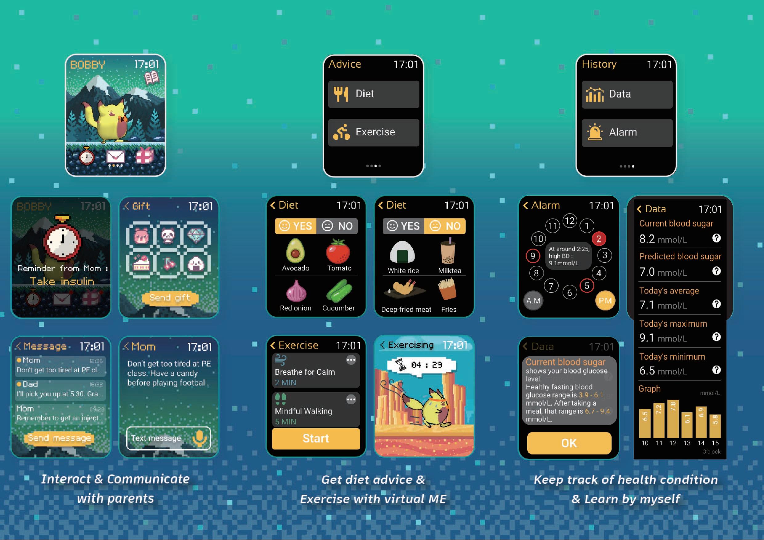Applications designed for enhancing diabetic children's ability of self-management, as well as allowing their parents to better understand and interact with children. Presented on smart watch for children and on mobile phones for parents.
