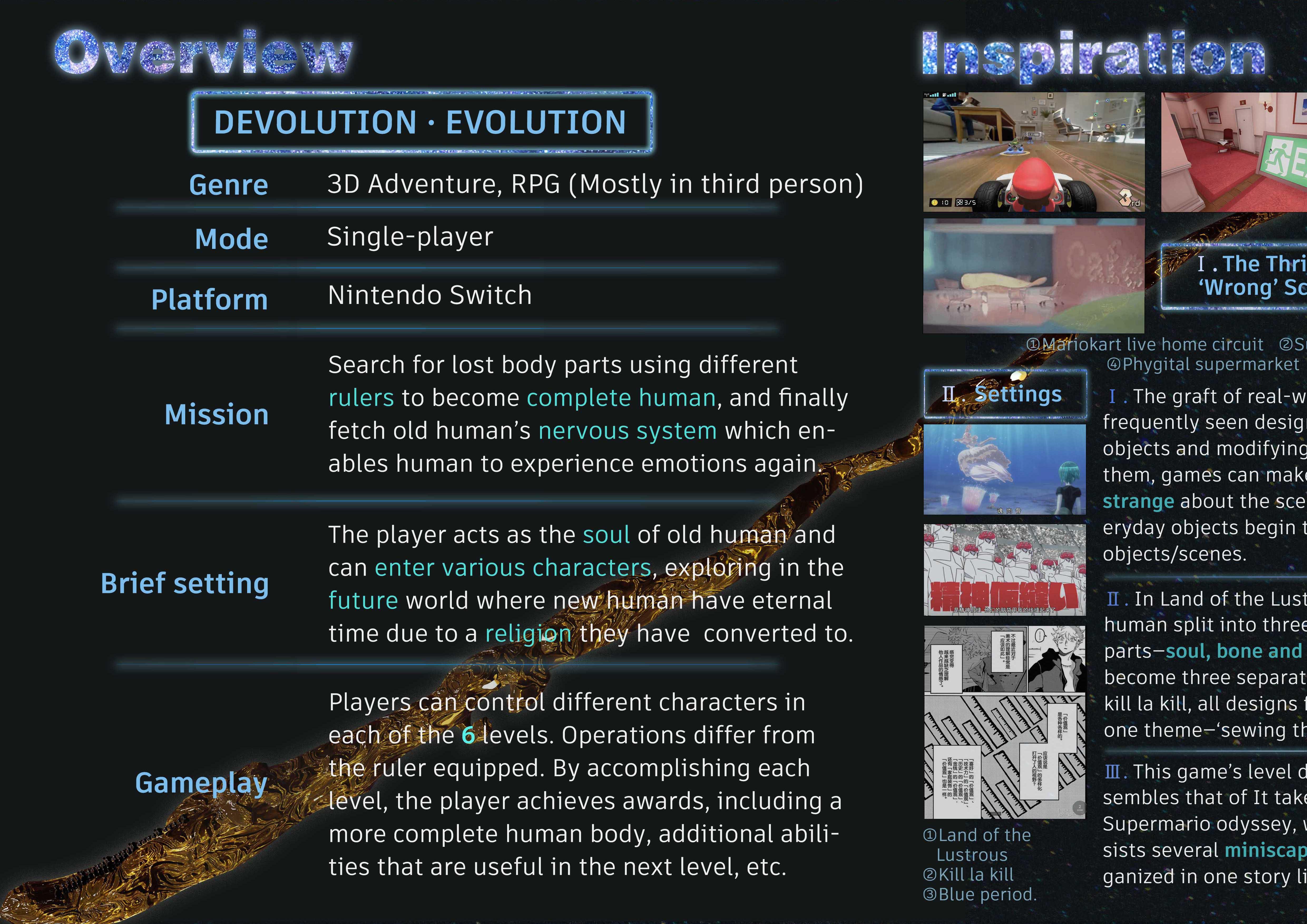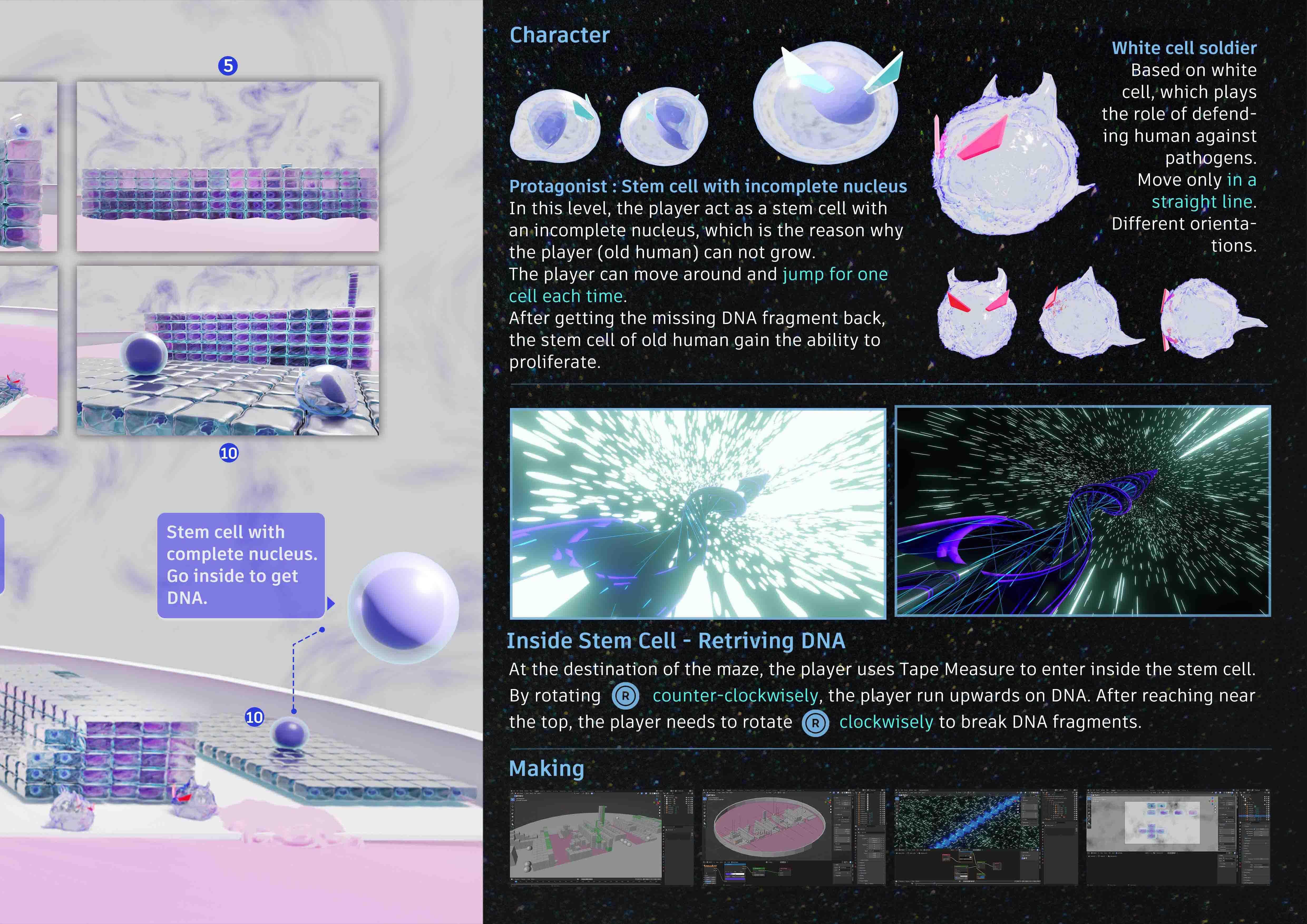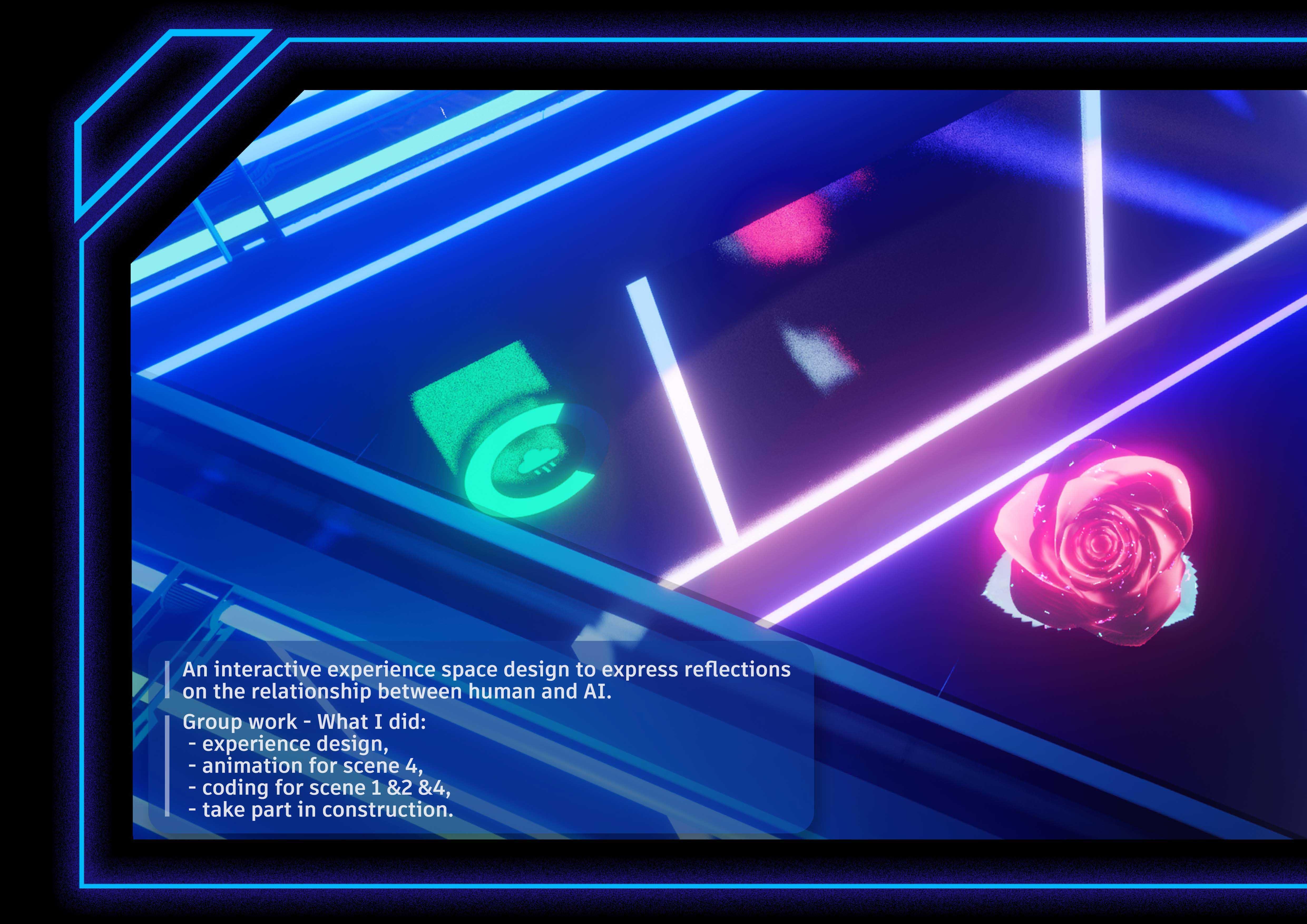 Brief description of each project: ① Devolution·Evolution: An adventure game design, telling the story of becoming complete human in a scientism-dominated future. Individual work. ② Do Androids Dream of Electric Rose? An interactive experience space design to express reflections on the relationship between human and AI. Group work. I did the experience design, the animation for scene 4, the coding for scene 1&2&4 and took part in the construction. ③ Welcome to La La Land: A virtual music world created to increase social opportunities purely through mutual interests on music. Group work. I did the concept design, visualization mapping, generate logic, UI design, AR and Eardrop design. ④ I Taking Care of Me: Applications designed for enhancing diabetic children's ability of self-management, as well as allowing their parents to better understand and interact with children. Presented on smart watch for children and on mobile phones for parents. Individual work.