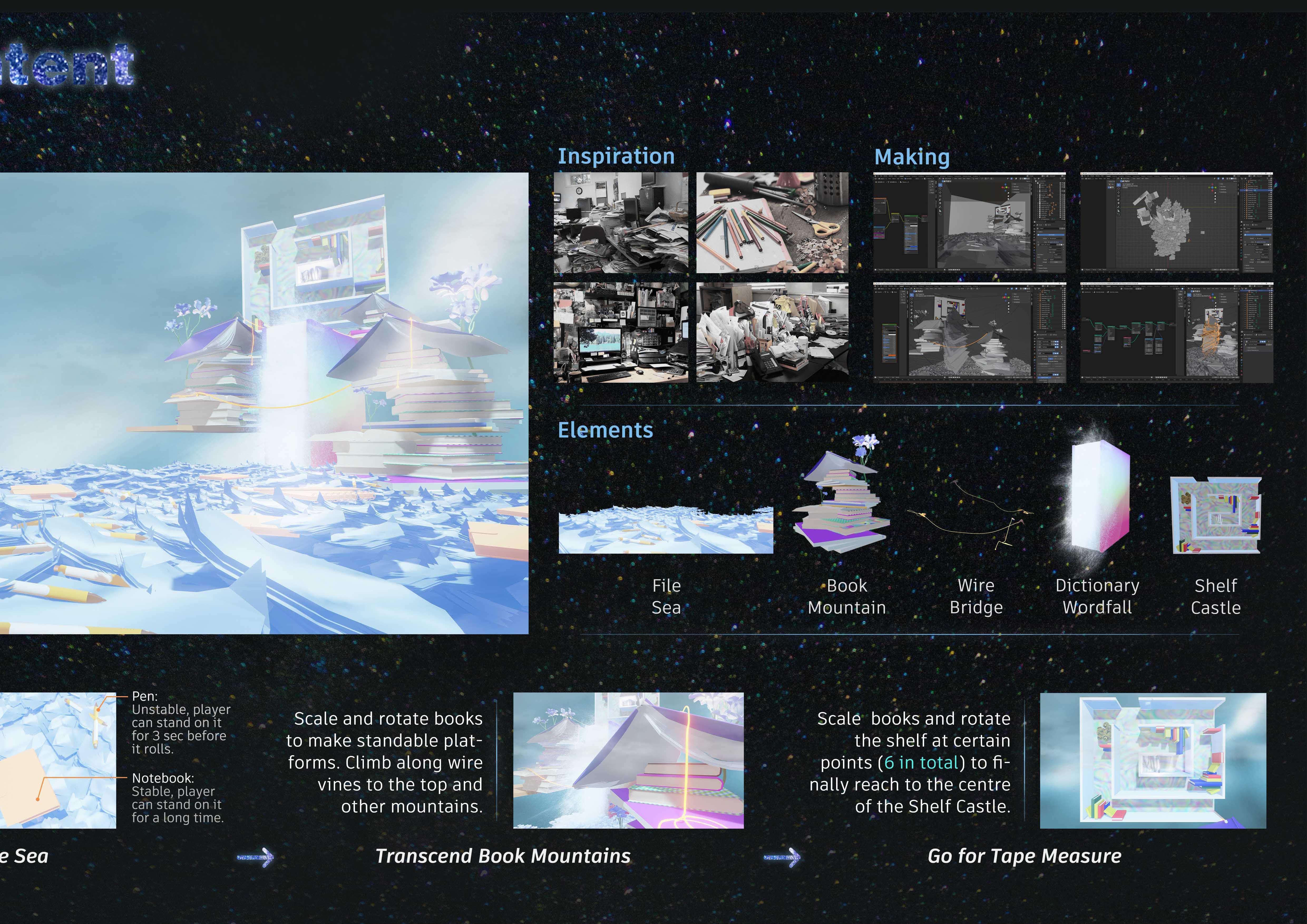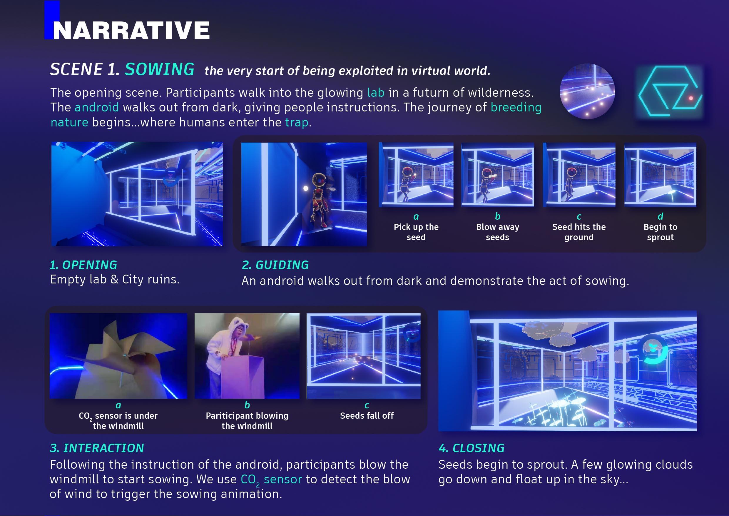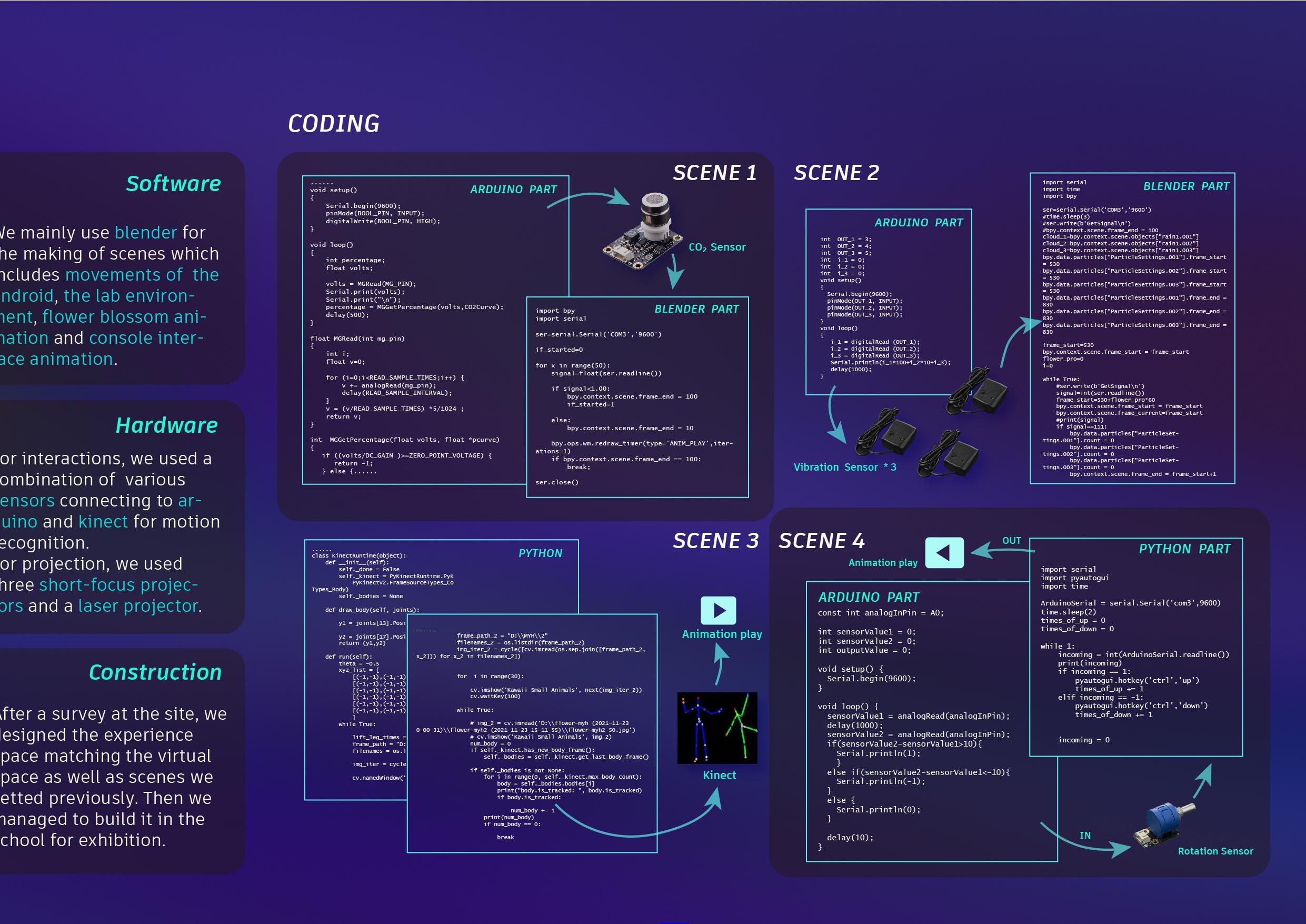 Group work. I did the experience design, the animation for scene 4, the coding for scene 1&2&4 and took part in the construction.