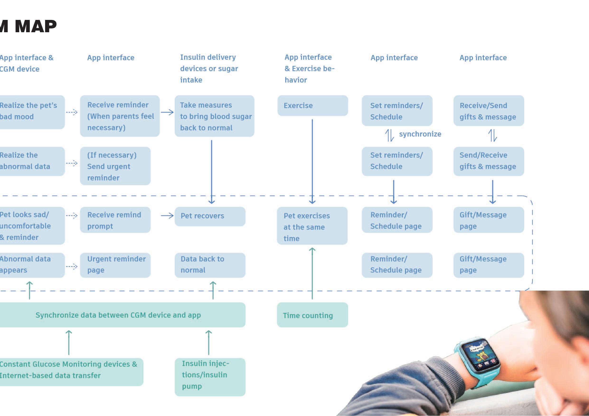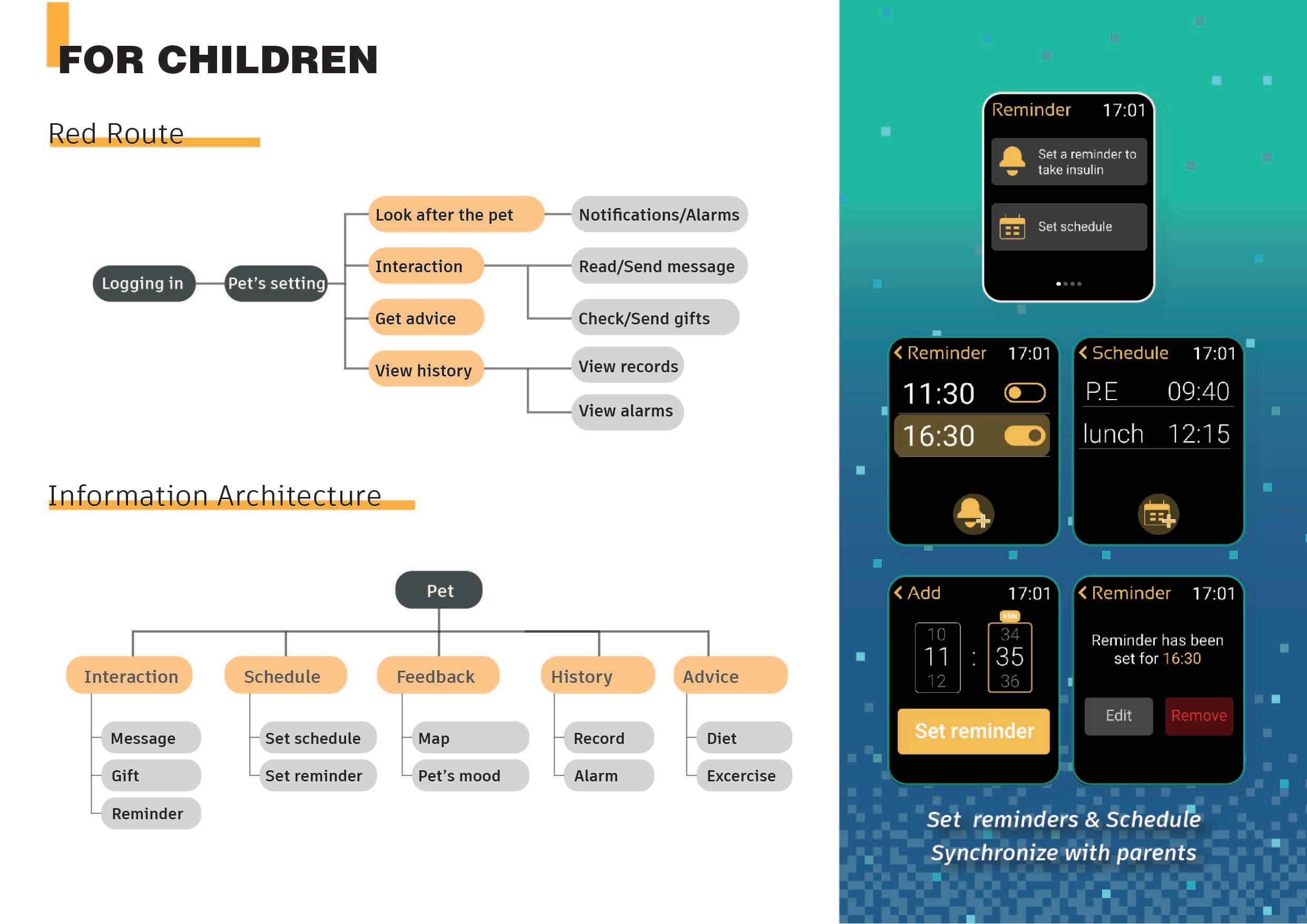 Applications designed for enhancing diabetic children's ability of self-management, as well as allowing their parents to better understand and interact with children. Presented on smart watch for children and on mobile phones for parents.