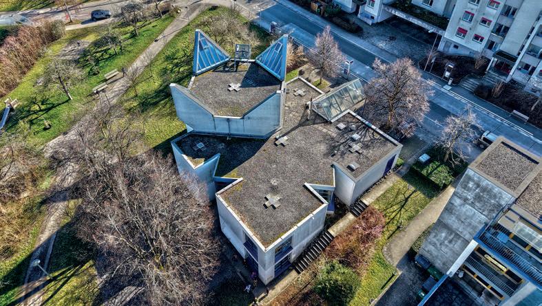 Kirche Suteracher (Zürich-Altstetten): 1982 von der reformierten Kirchgemeinde erbaut – ein Beispiel gelebter Nutzungserweiterung: Unter der Woche Schulbetrieb mit Hort und Musikunterricht, am Wochenende Nutzung durch Migrationskirchen. Foto: Markus Staudinger