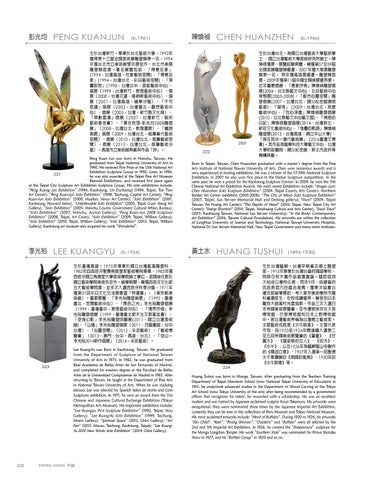 Peng Kuan Jun was born in Hsinchu, Taiwan. He graduated from Taipei National University of Arts in 1990. He received First Prize at the 13th National Art Exhibition Sculpture Group in 1992. Later, in 1994, 221 he was also awarded at the Taipei Fine Art Museum Biennial Exhibitions, and received first place again at the Taipei City Sculpture Art Exhibition Sculpture Group. His solo exhibitions include: “Peng Kuang Jun Exhibition ” (1994, Kaohsiung, Un Duchamp) (1994, Taipei, Tsai Tian Art Center); “Peng Kuan-Jun Solo Exhibition ” (1998, Taichung, Capital Art Center); “Peng Kuan-Jun Solo Exhibition ” (2000, Hualian, Venus Art Center); “Solo Exhibition ” (2001, Kaohsiung, Howard Salon); “Unbelievable Solo Exhibition ” (2003, Taipei Guan Xiang Art Gallery); “Solo Exhibition ” (2005, Hsinchu County Government Cultural Affairs Bureau); “Solo Exhibition ” (2007, Hsinchu, Accton Gallery); “Pang Kuan-Jun 2008 Sculpture Exhibition ” (2008, Taipei, Art Caves), “Solo Exhibition ” (2009, Taipei, William Gallery); “Solo Exhibition ” (2010, Taipei, William Gallery); “Solo Exhibition ” (2013, Taipei, William Gallery). Kaohsiung art museum also acquired his work “Wonderful ”.
