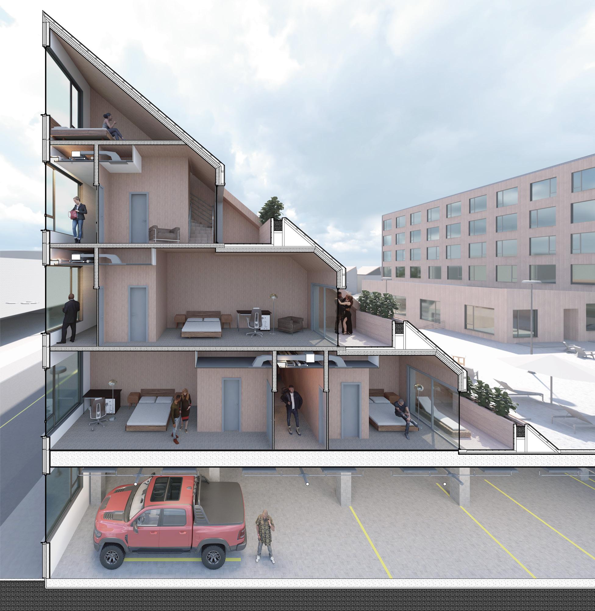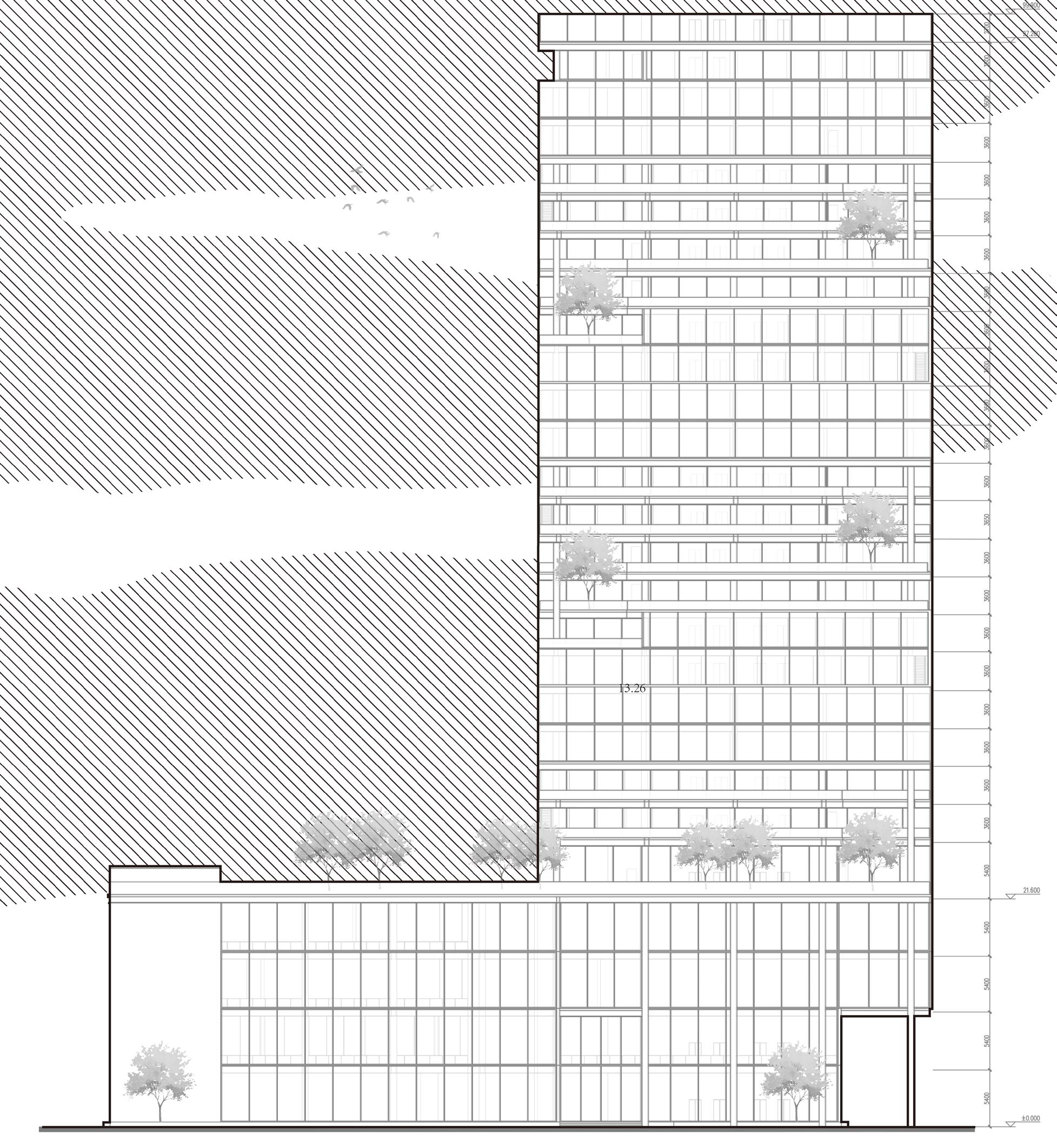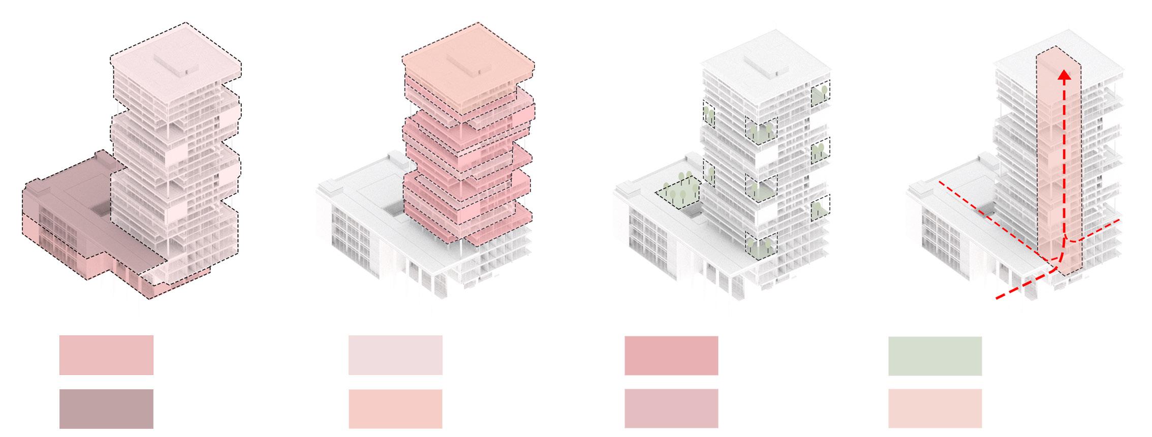 The original intention of this design is to create a shared vertical community for urban office workers. The building's configuration fosters communication and interaction among users on each floor.