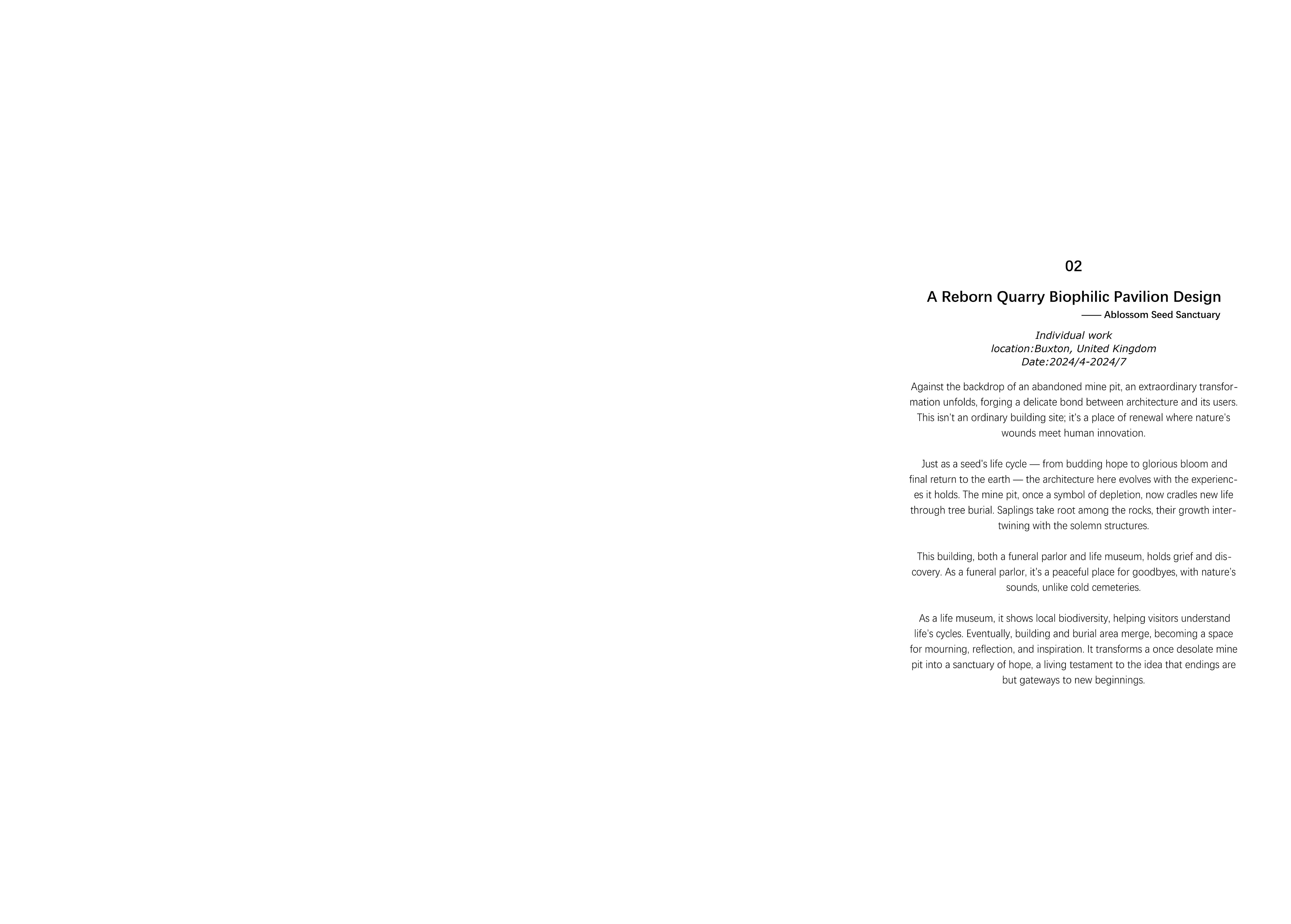 Architectures are like 'seed spaces' one by one. With the passage of time, they germinate, grow, blossom, and even wither away. Yet, the end doesn't mean disappearance; instead, it's a gateway to another beginning, holding the promise of renewed creativity and rebirth, as if each cycle of architectural evolution is an unwritten storybook, flipping to its next thrilling chapter full of infinite possibilities.