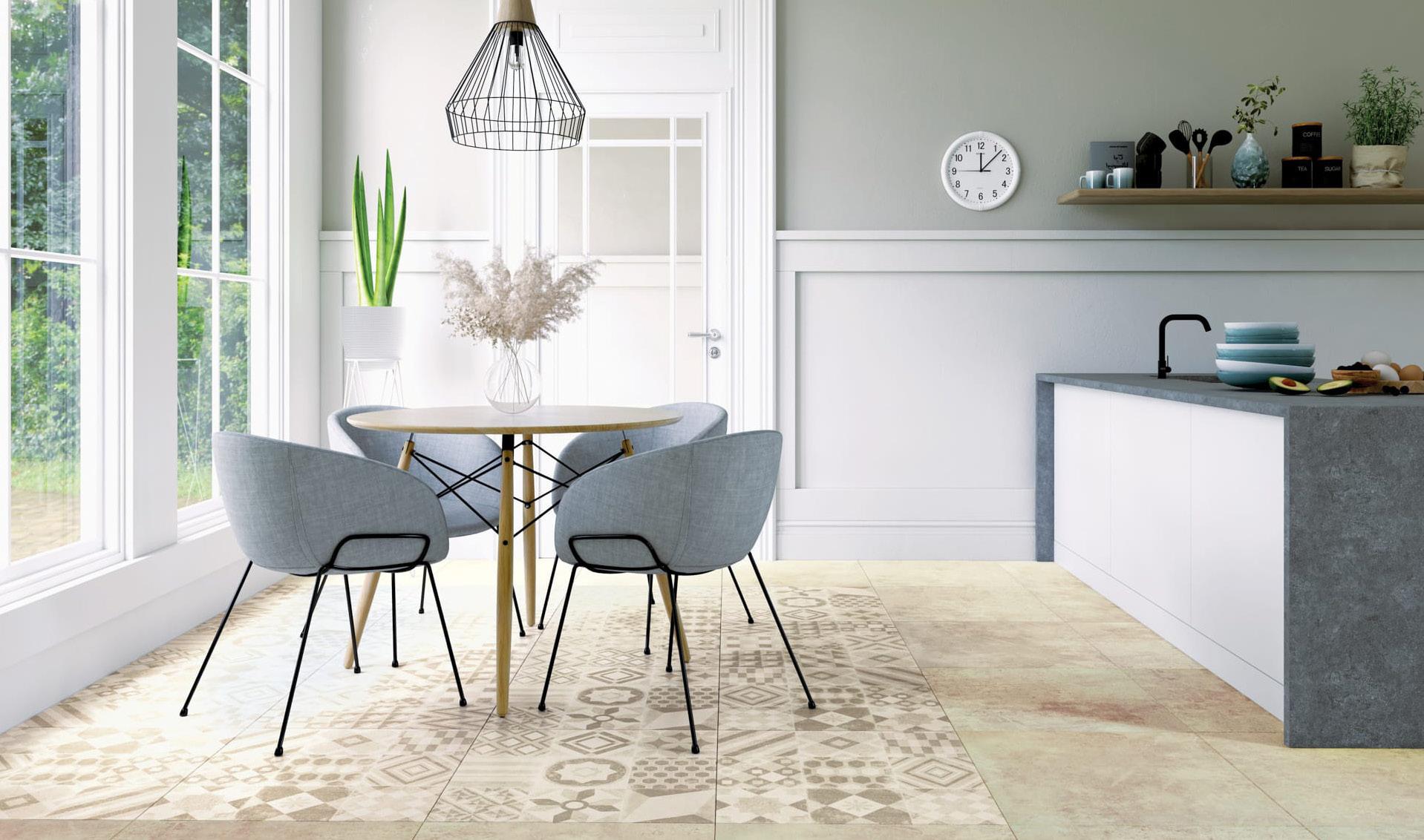Mirne i prijatne krem i sive nijanse u skladu sa majolika dekorom, naglašavaju dinamiku i stvaraju impresionističku atmosferu koja nikoga neće ostaviti ravnodušnim. Njen dizajn uključuje kompaktnu bazu, blago posutom tamnim opiljcima, delikatno predstavljajući industrijski beton.