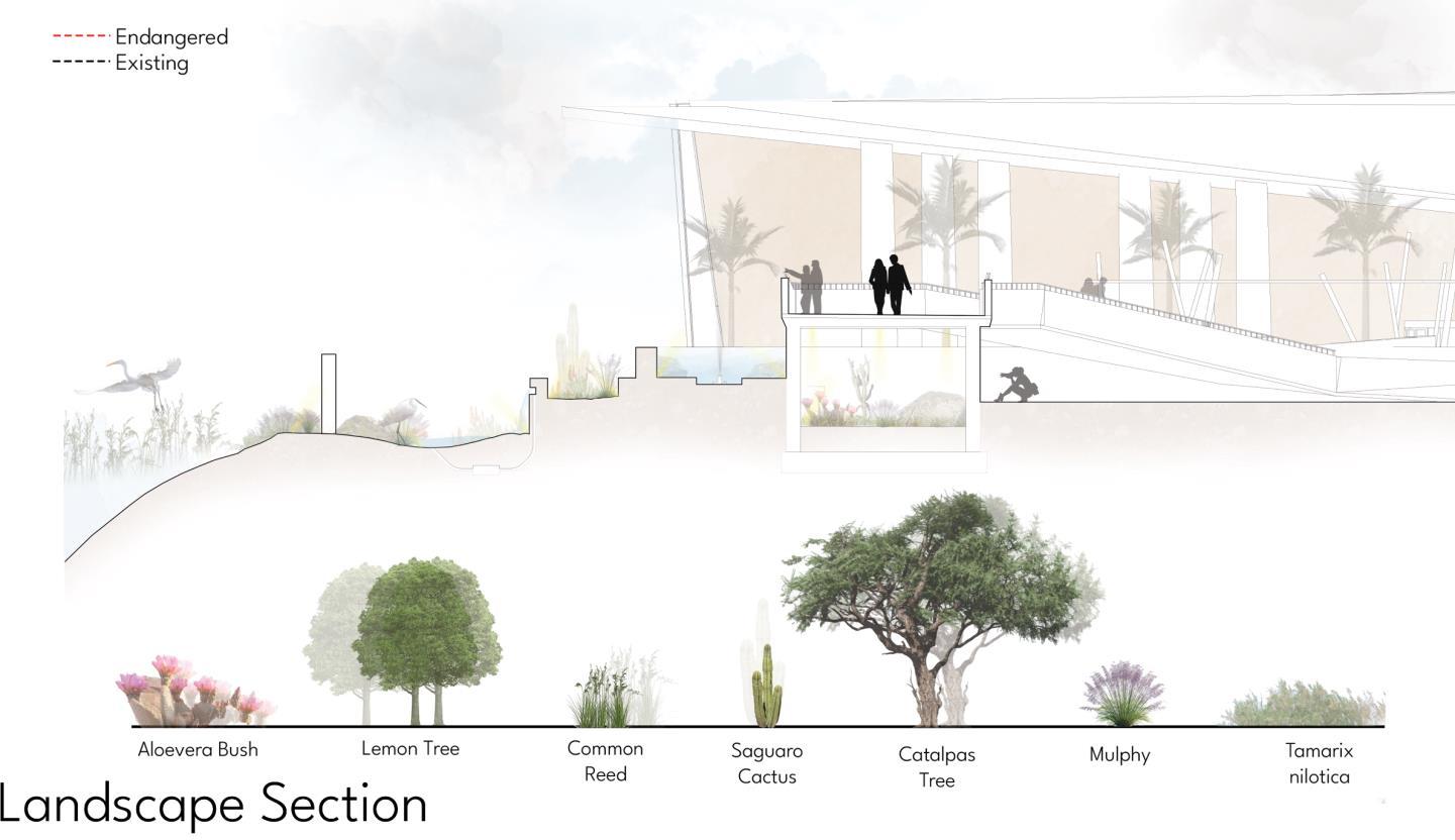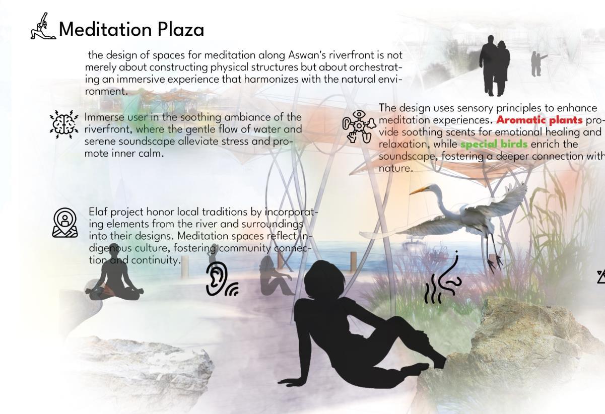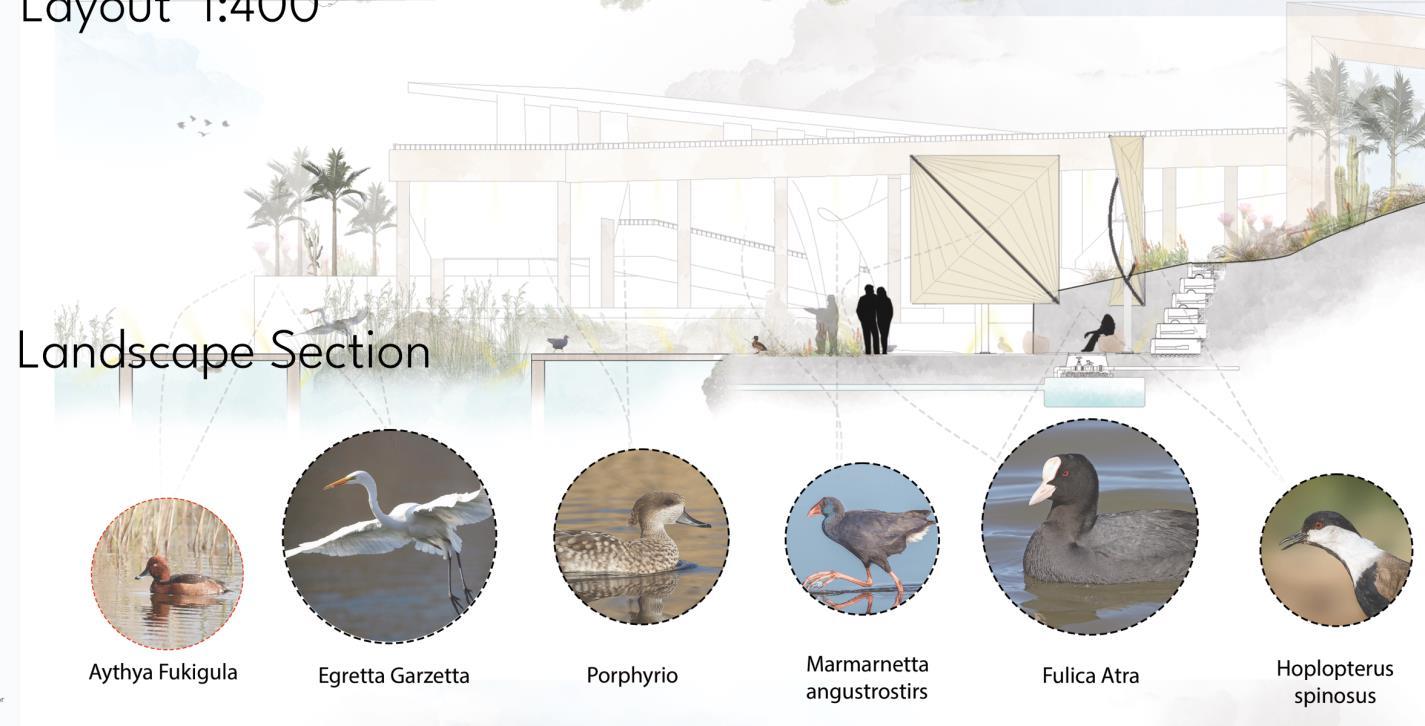 The project also focuses on creating habitats that support a diverse range of local wildlife, enhancing the ecological diversity of the area. The animal species considered in the design include Aythya fukigula (Tufted Duck), Egretta garzetta (Little Egret), Porphyrio porphyrio (Purple Swamphen), Marmaronetta angustirostris (Marbled Teal), Fulica atra (Common Coot), and Hoplopterus spinosus (Spur-winged Lapwing) These species, listed by the Egyptian Ministry of Environment, thrive in wetlands, marshes, and shallow waters, environments that the project's landscaping aims to replicate. By incorporating water bodies and planting native species along the Nile shoreline, the center provides essential habitats and feeding grounds for these birds. This habitat creation not only supports the survival of these species but also contributes to the overall biodiversity and ecological health of the region.