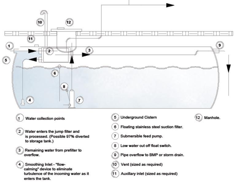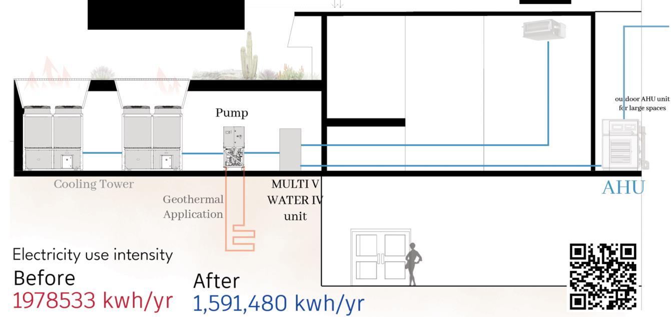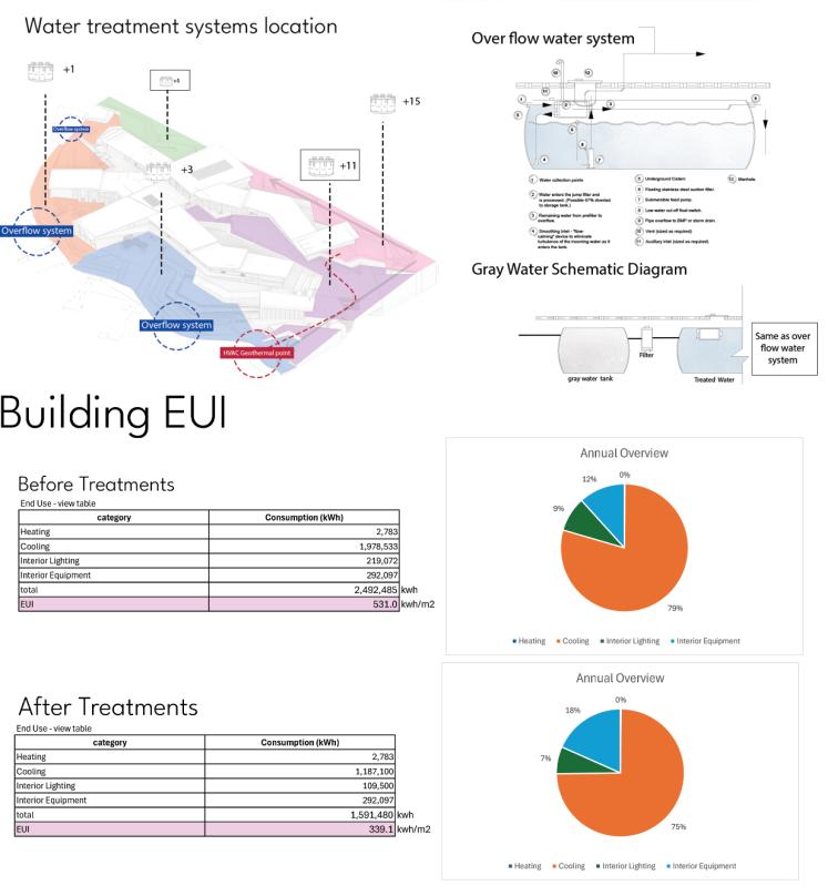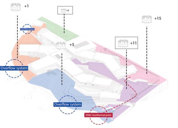 The water overflow system is designed to collect and reuse excess water from rainwater harvesting systems, cooling towers, and other potential overflow sources. This collected water is stored in dedicated overflow tanks and reused for irrigation and landscape maintenance, significantly reducing the need for fresh water Additionally, one of the overflow tanks is integrated with the HVAC geothermal unit, supplying it with a sustainable water source for cooling purposes. This integration not only enhances the efficiency of the geothermal unit but also supports overall water conservation efforts by minimizing the reliance on potable water for non-potable applications. The water overflow system is strategically distributed across various levels and areas of the project to ensure optimal water collection and reuse.